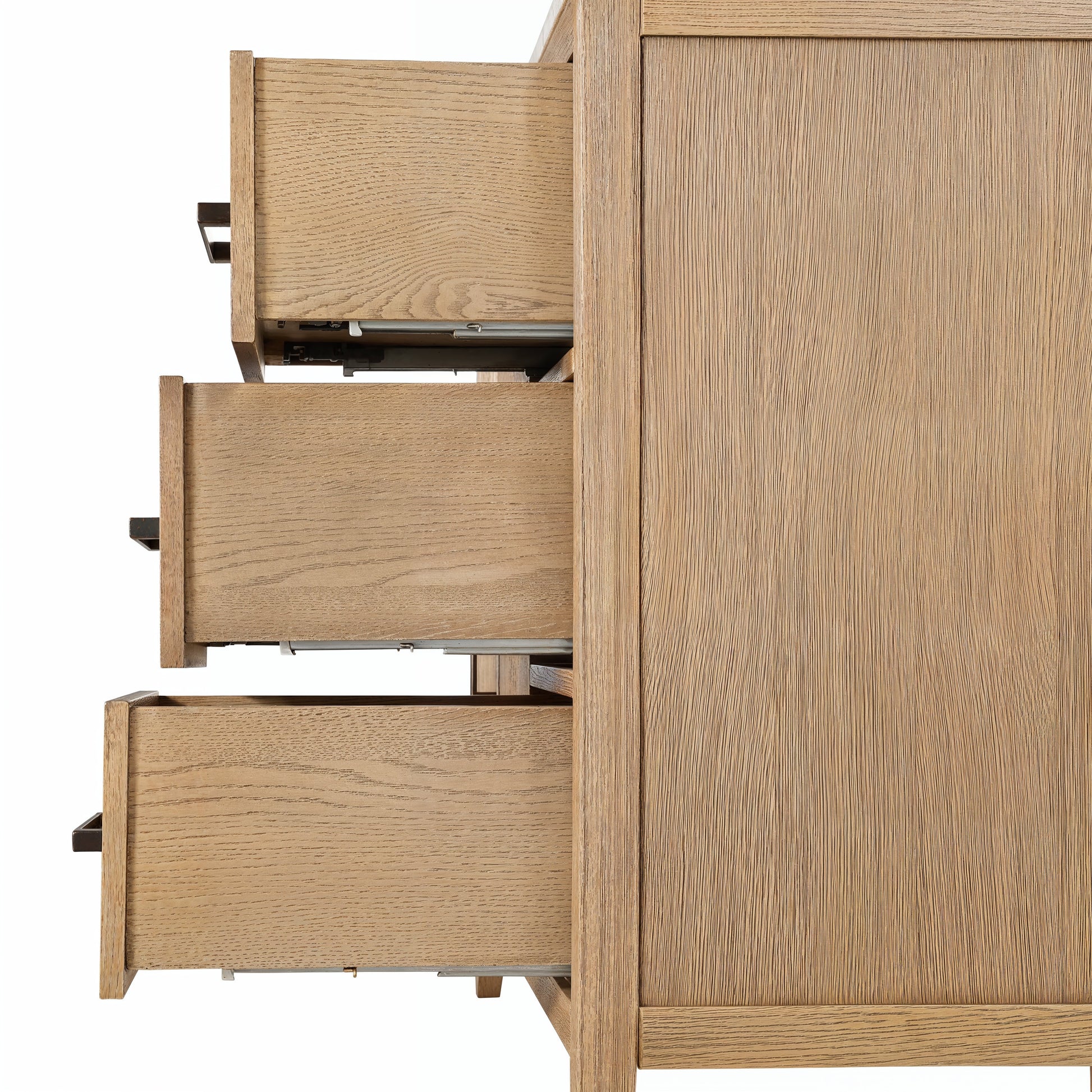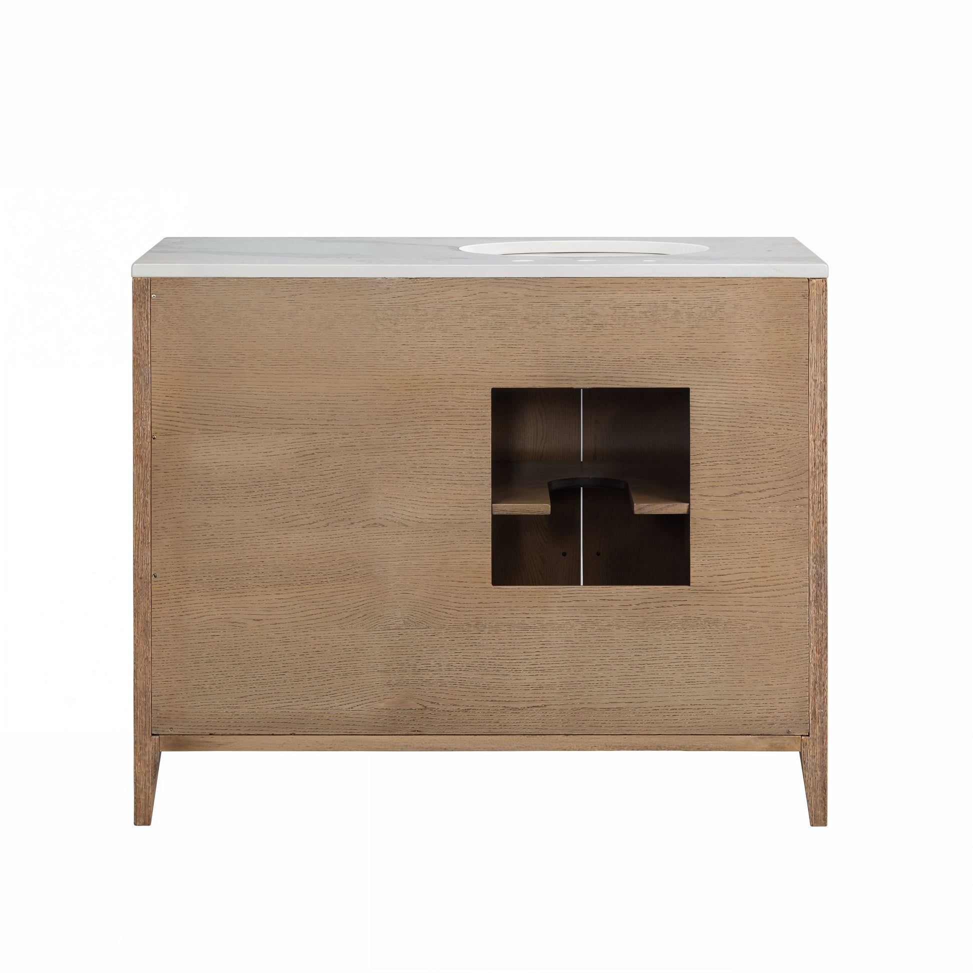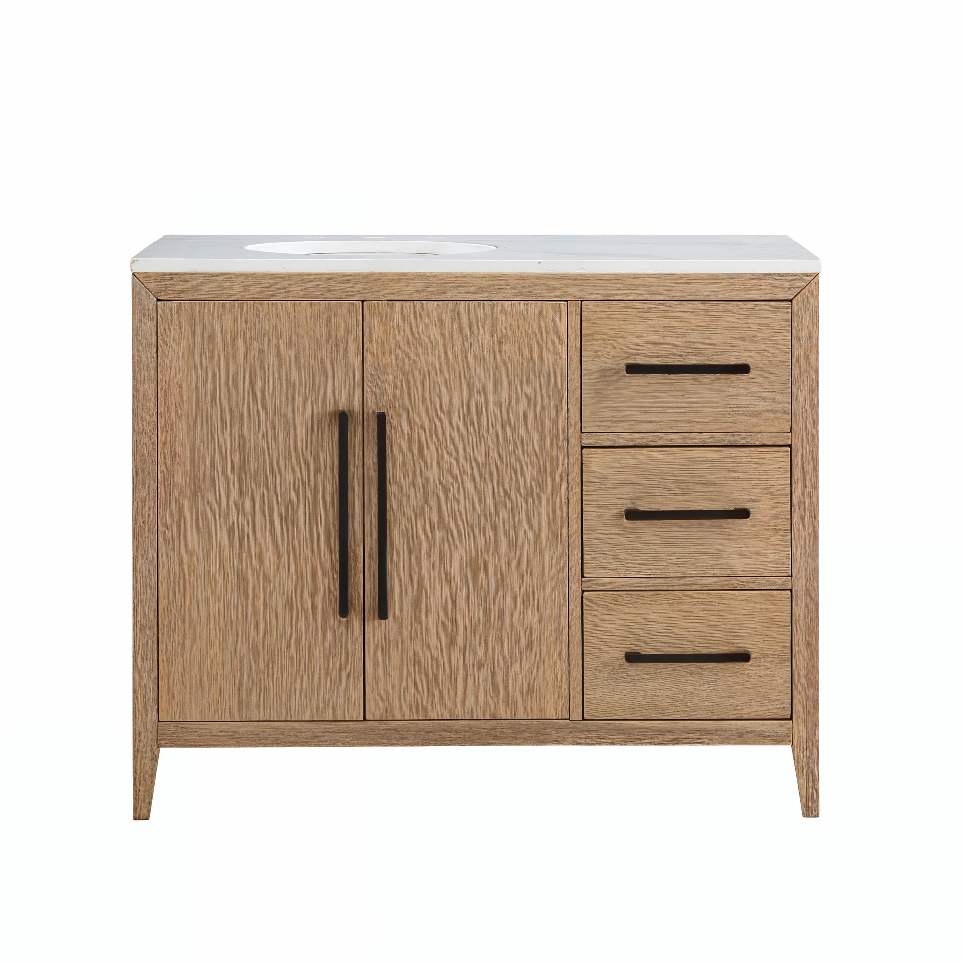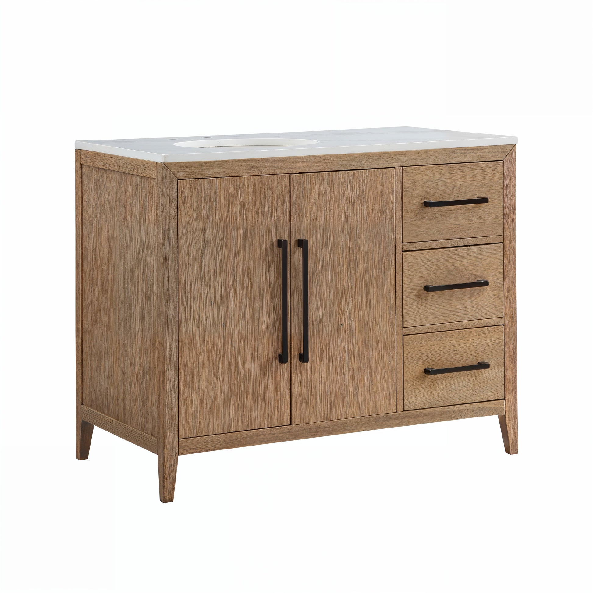Elevate your bathroom with the Alsup single bathroom vanity, a timeless classic that seamlessly blends into any décor from traditional to modern. This premium 42" freestanding vanity features a solid wood frame with a multi-step finish on oak veneer, standing on elegant tapered legs for sophisticated appeal. Generous storage includes 3 soft-close drawers and 2 cabinet doors with adjustable shelves, providing ample space for all your bathroom essentials. Topped with luxurious Calacatta Gold Quartz countertop and a left side ceramic undermount sink, this designer bathroom furniture combines functionality with enduring quality built to last a lifetime.