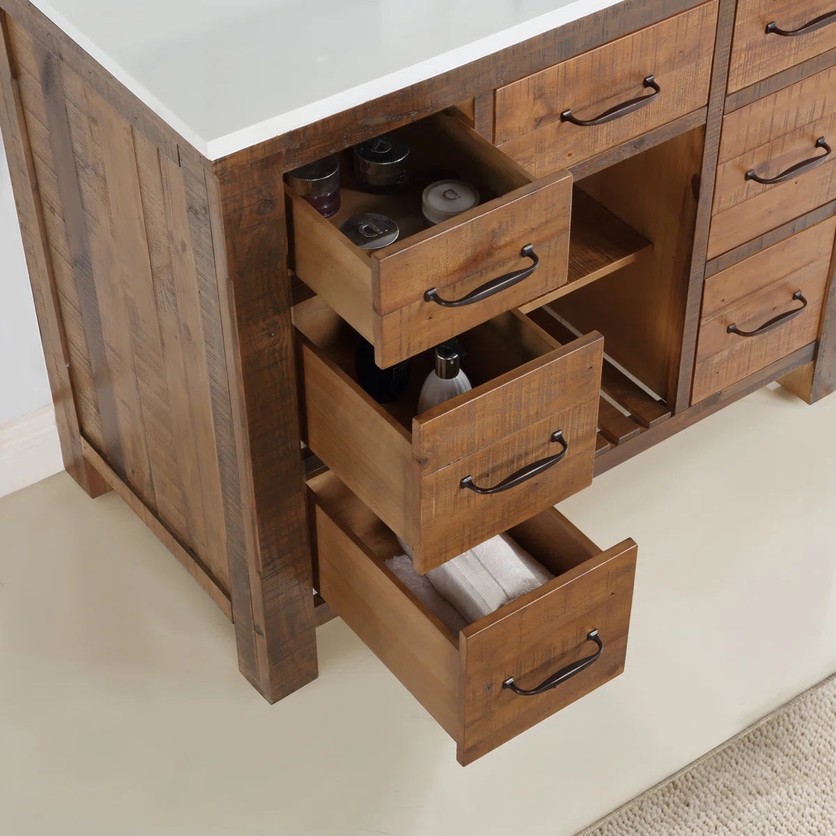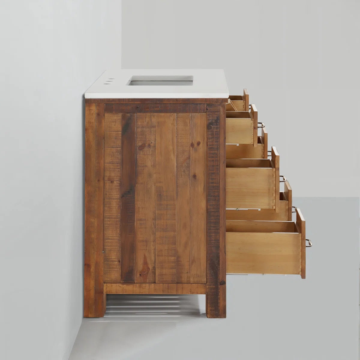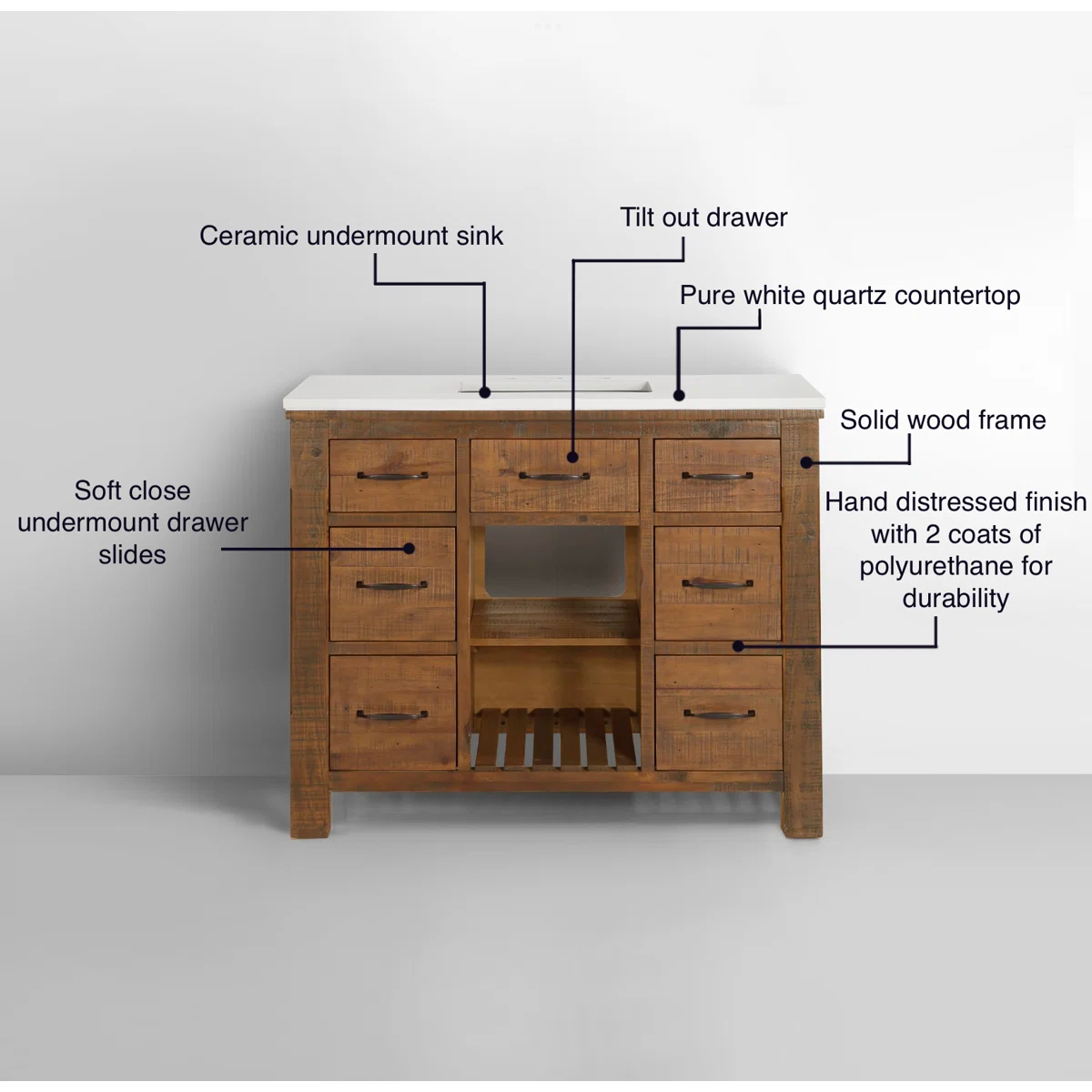 Bring farmhouse charm into your bathroom but with the benefit of modern conveniences. This sturdy vanity will last for years to come. It features pure white quartz with a matte finish top resting upon a solid pine, hand-finished frame. Ample storage is provided by soft-close, undermount drawers built with dovetail joinery.