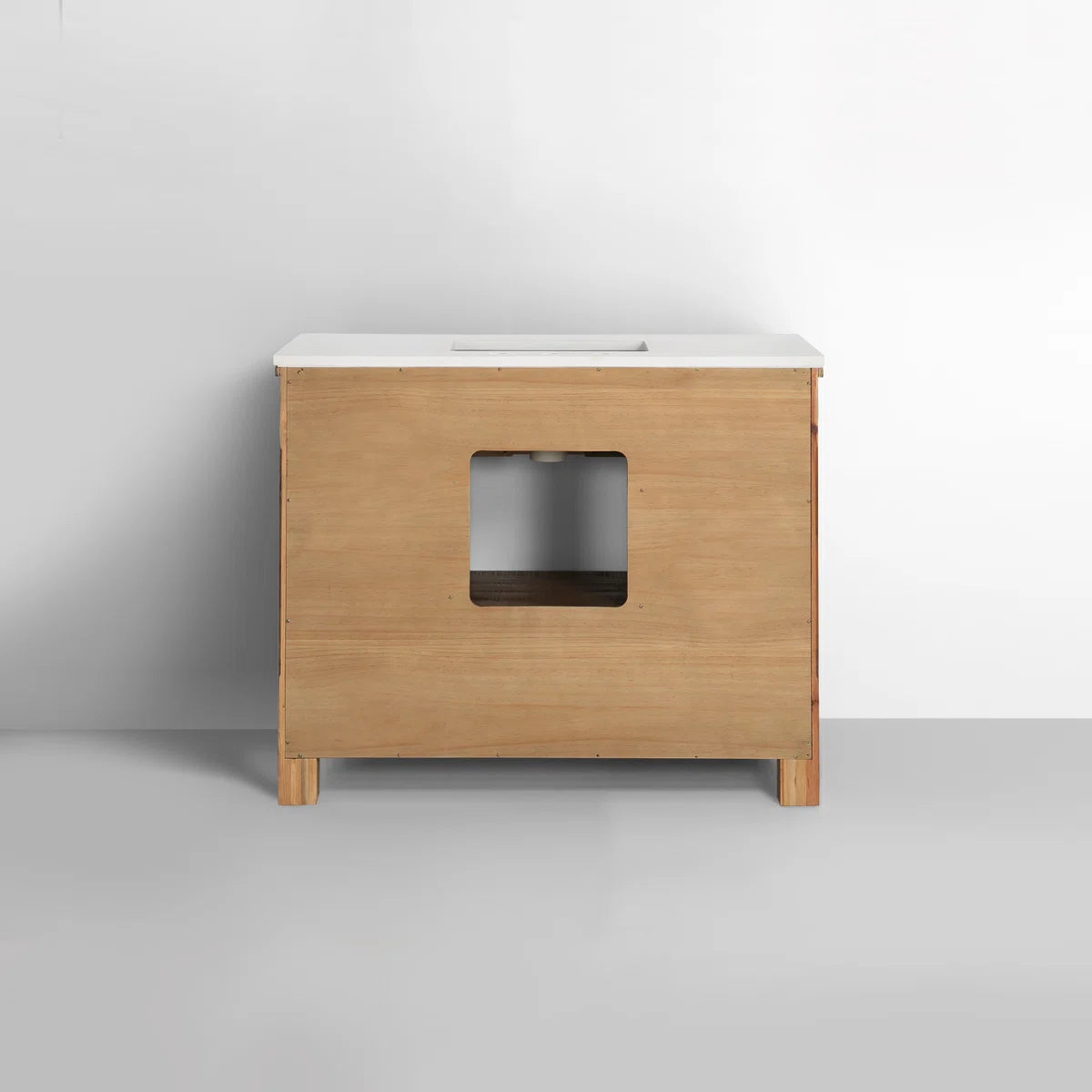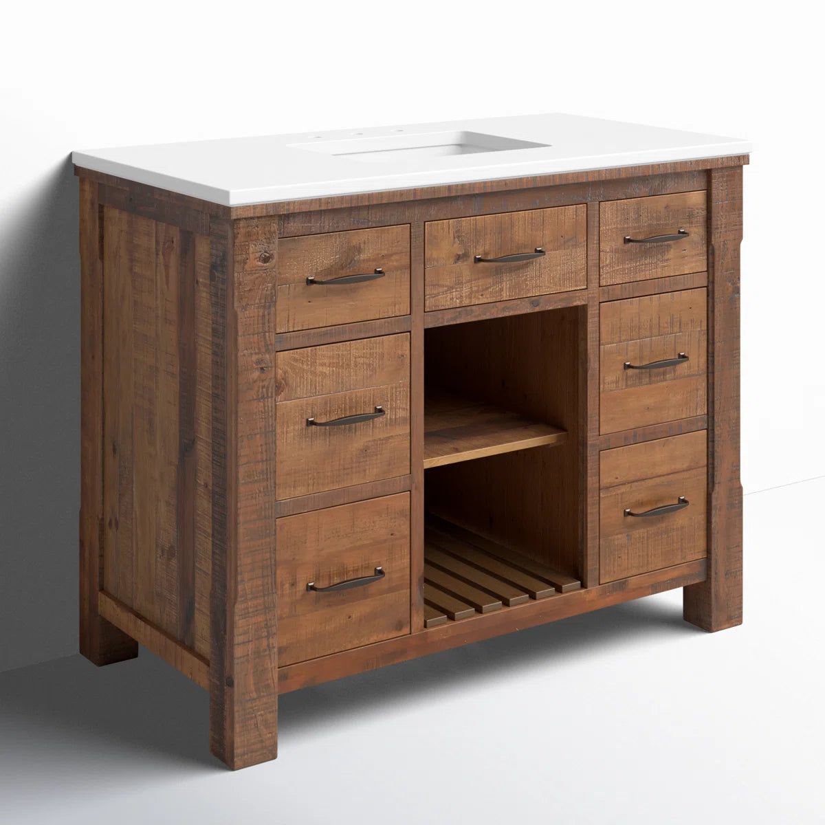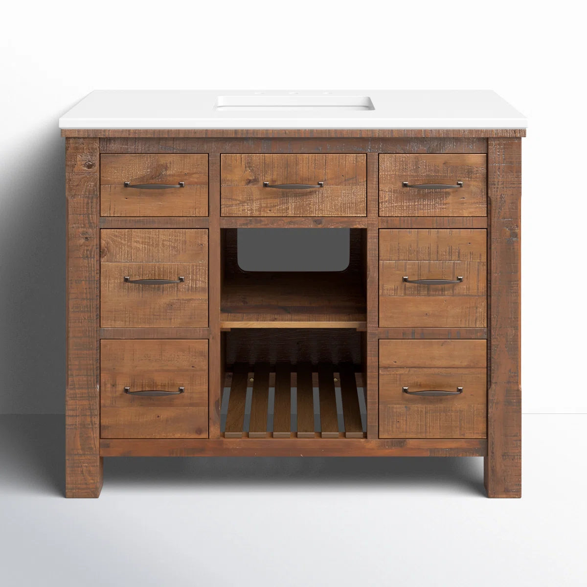 Bring farmhouse charm into your bathroom but with the benefit of modern conveniences. This sturdy vanity will last for years to come. It features pure white quartz with a matte finish top resting upon a solid pine, hand-finished frame. Ample storage is provided by soft-close, undermount drawers built with dovetail joinery.