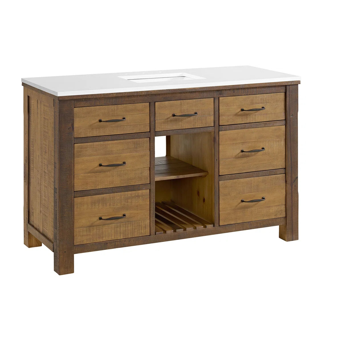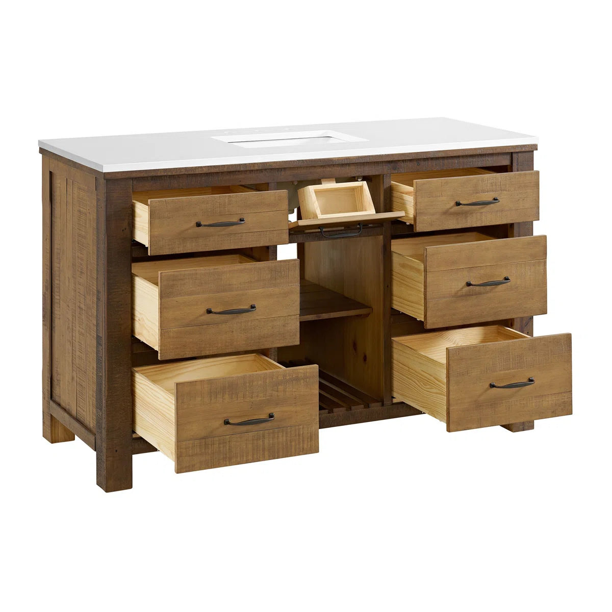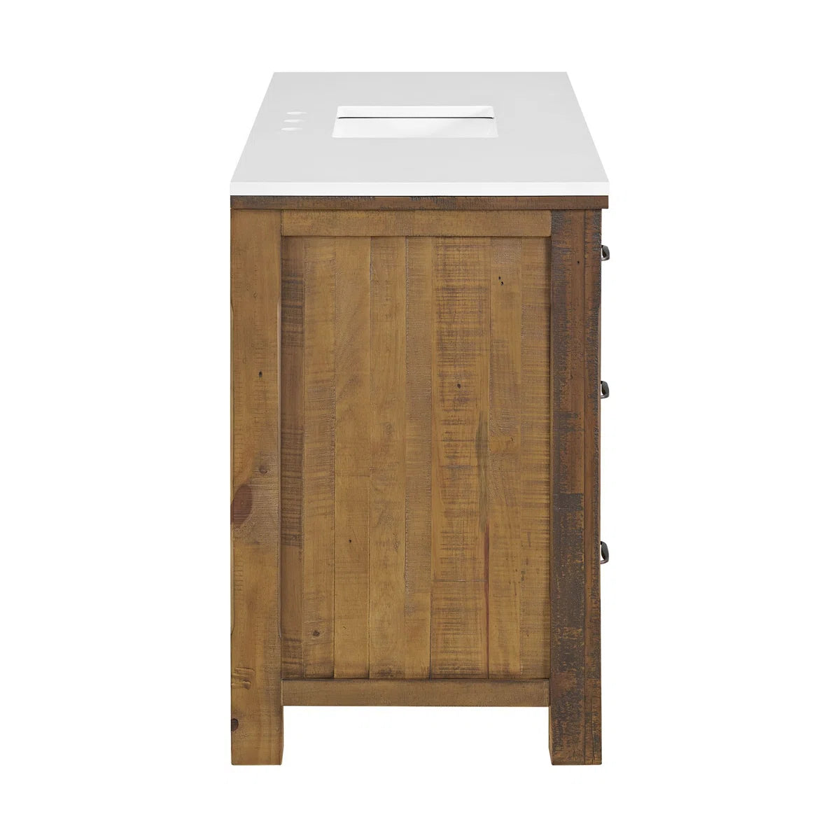 Bring farmhouse charm into your bathroom but with the benefit of modern conveniences. This sturdy vanity will last for years to come. It features pure white quartz with a matte finish top resting upon a solid pine, hand-finished frame. Ample storage is provided by soft-close, undermount drawers built with dovetail joinery.