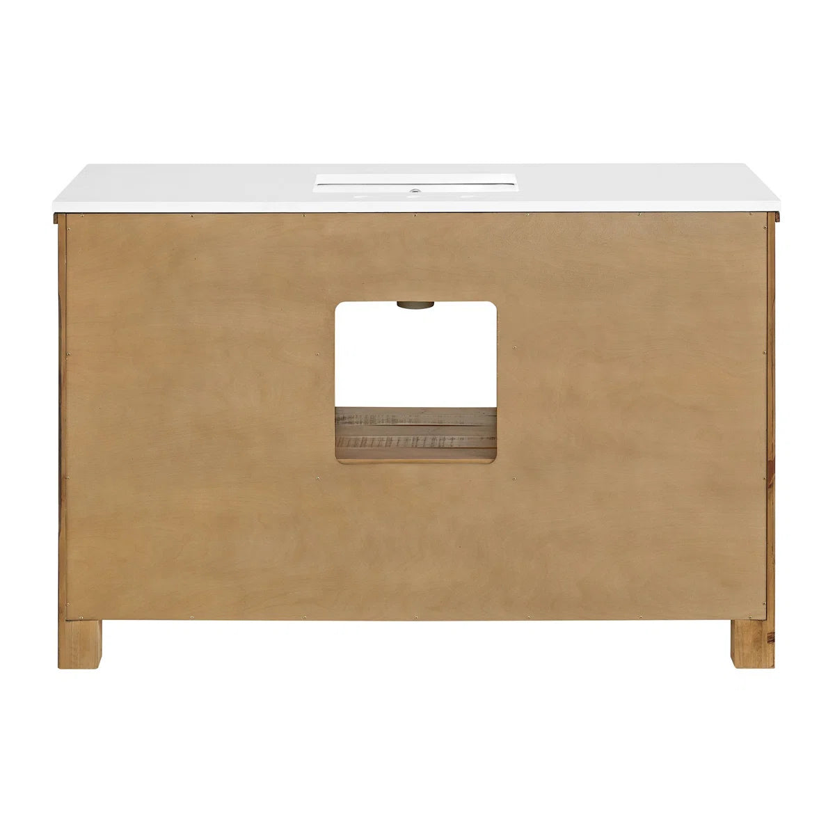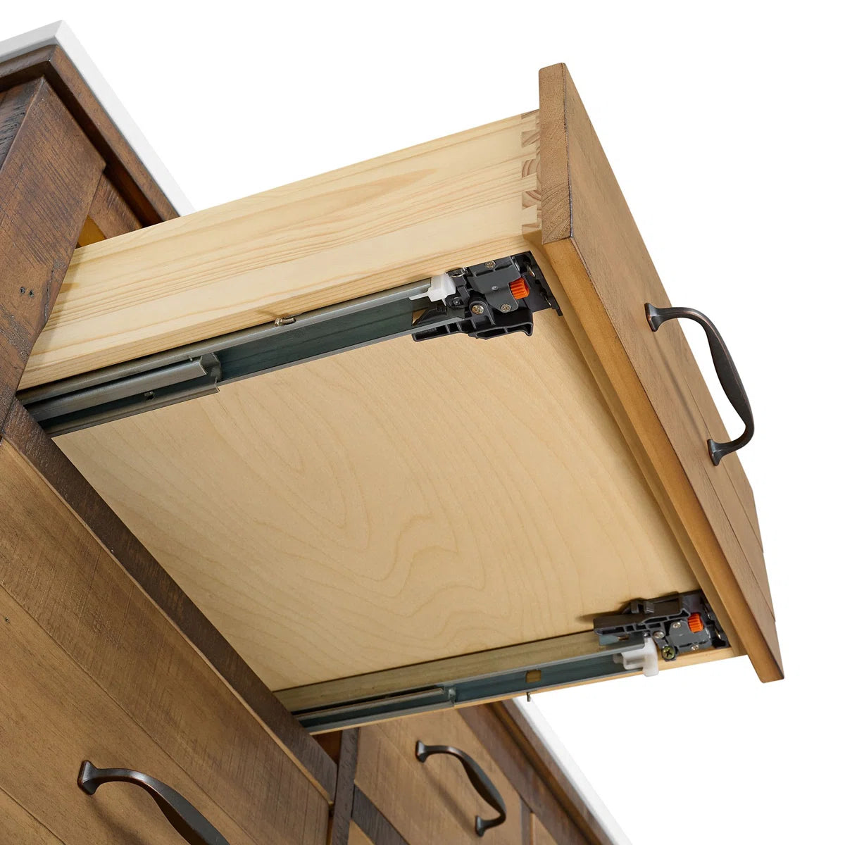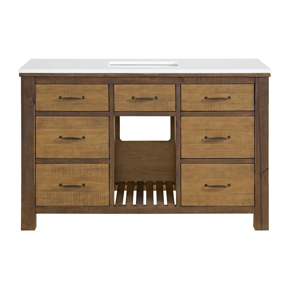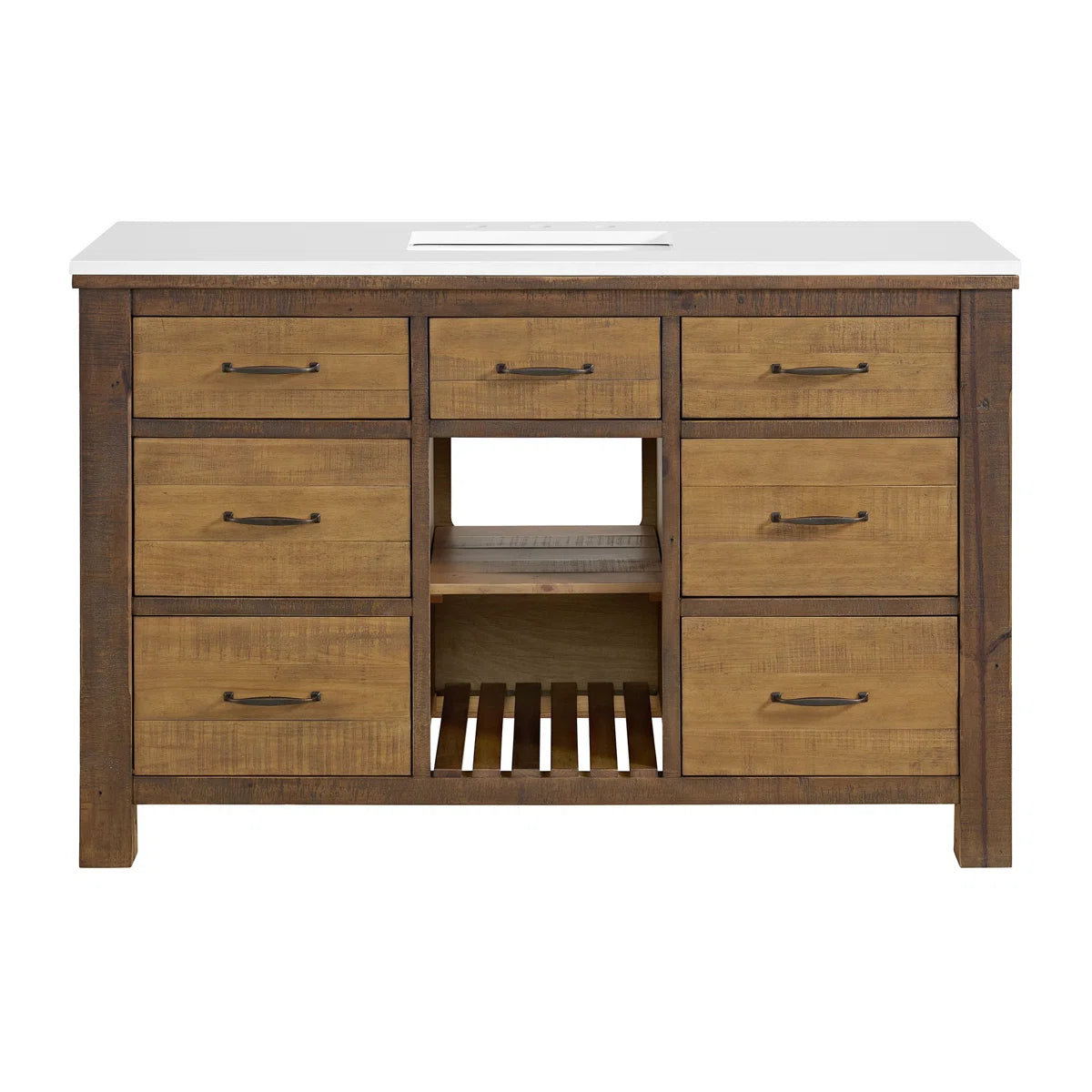 Bring farmhouse charm into your bathroom but with the benefit of modern conveniences. This sturdy vanity will last for years to come. It features pure white quartz with a matte finish top resting upon a solid pine, hand-finished frame. Ample storage is provided by soft-close, undermount drawers built with dovetail joinery.