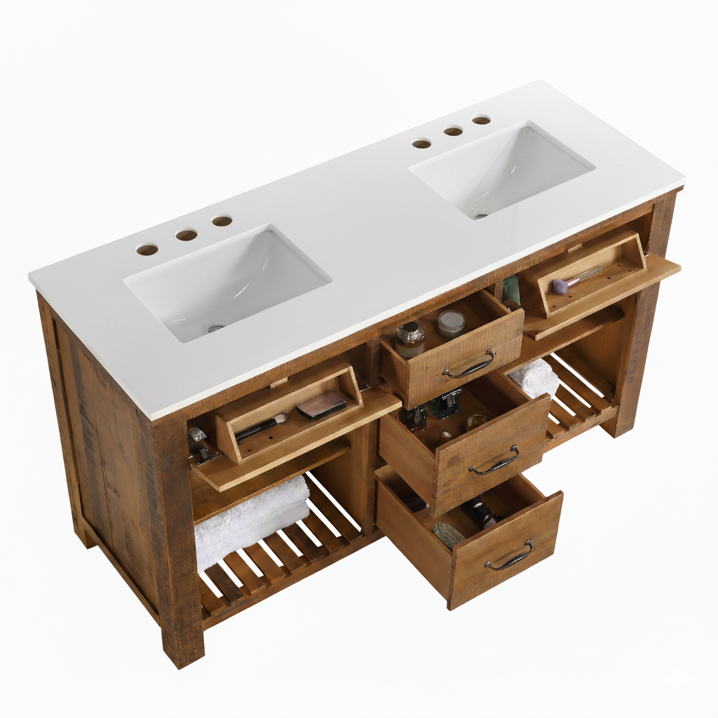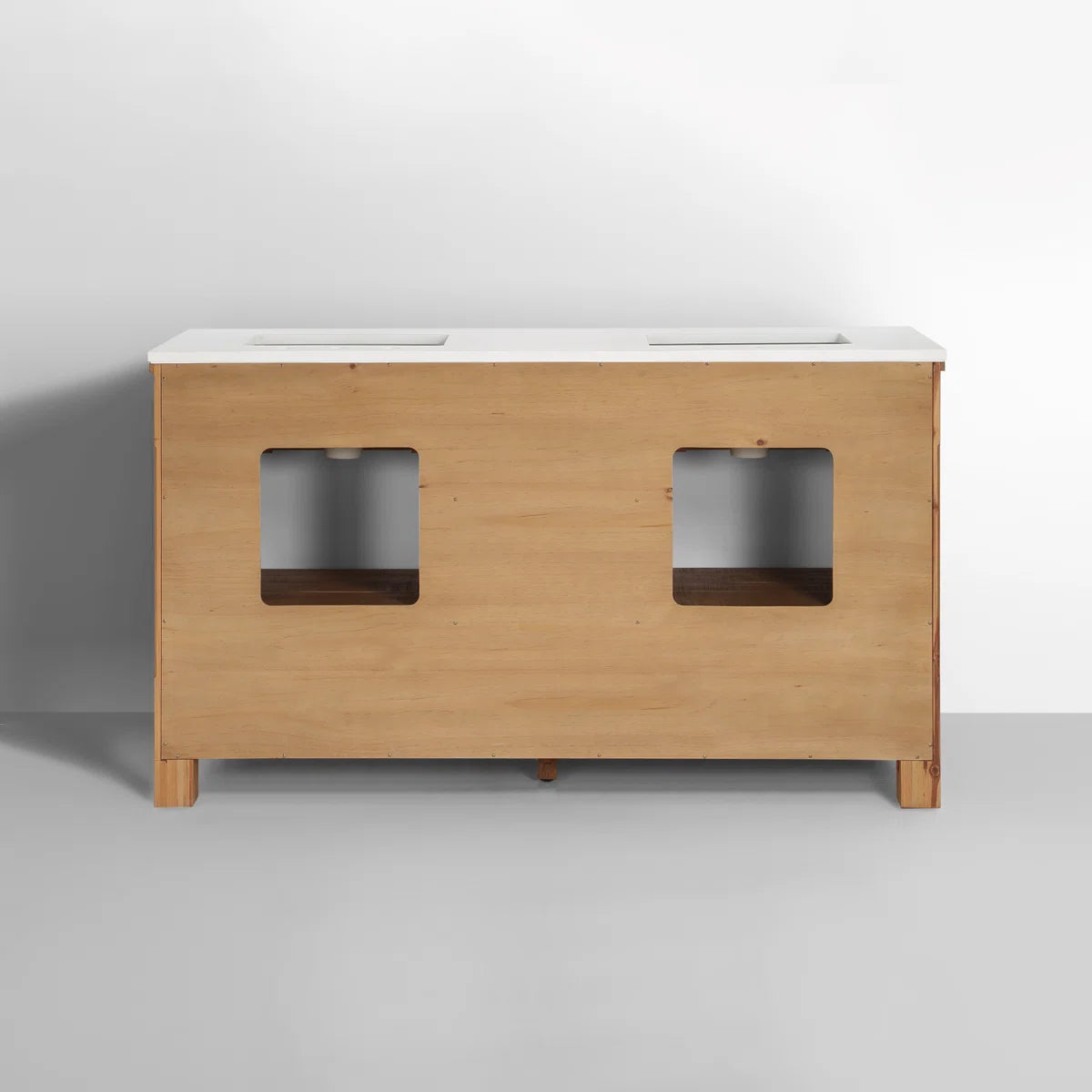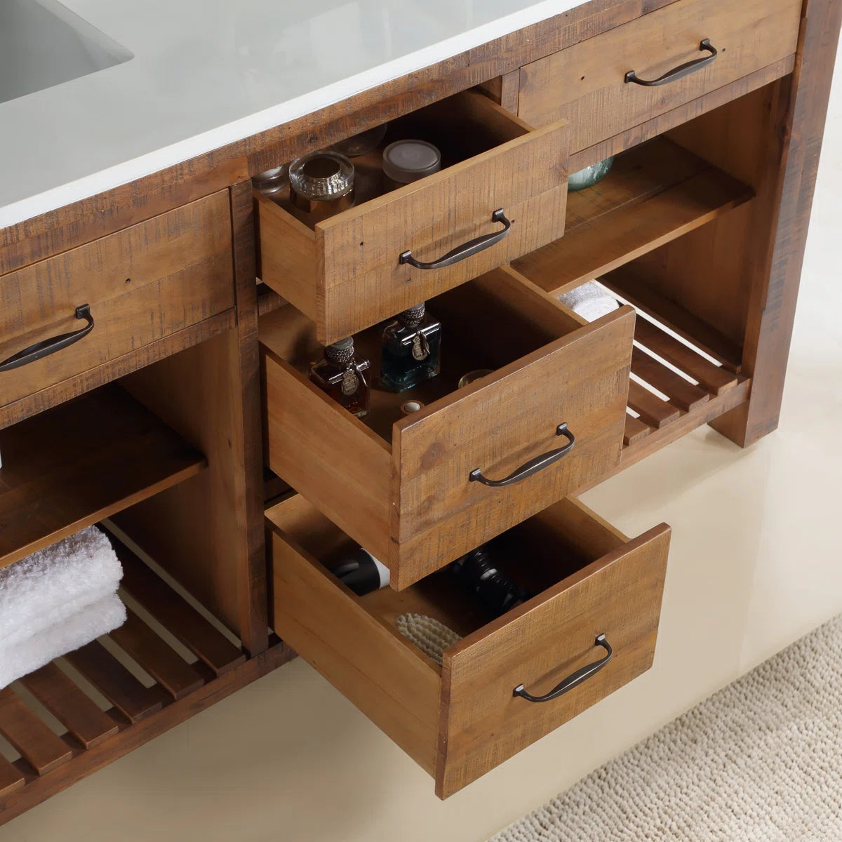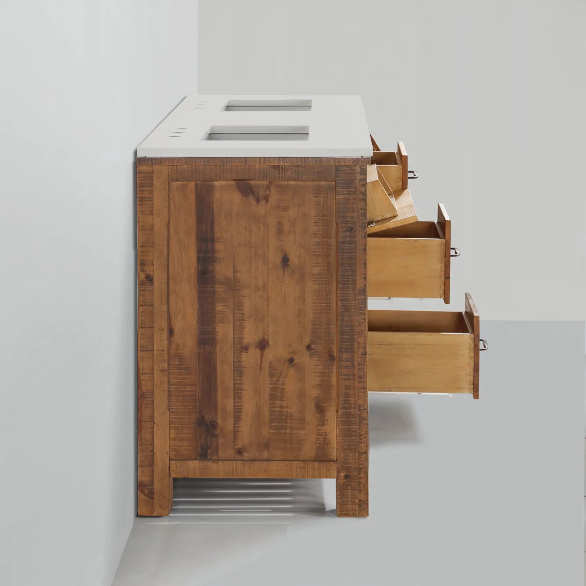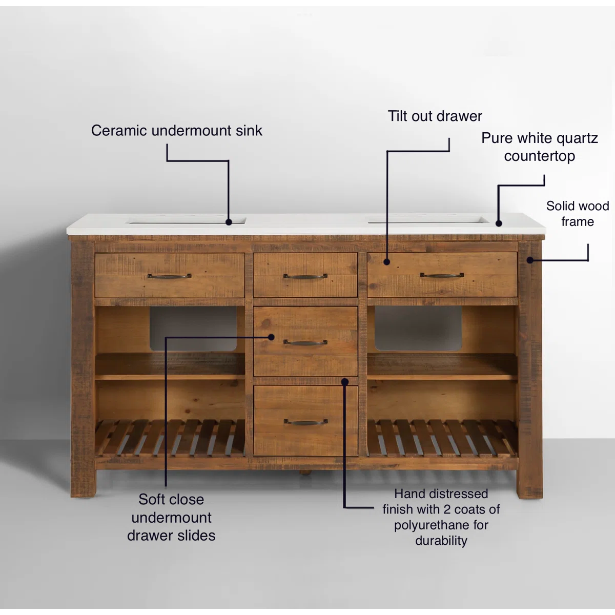 Bring farmhouse charm into your bathroom but with the benefit of modern conveniences. This sturdy vanity will last for years to come. It features pure white quartz with a matte finish top resting upon a solid pine, hand-finished frame. Ample storage is provided by soft-close, undermount drawers built with dovetail joinery.