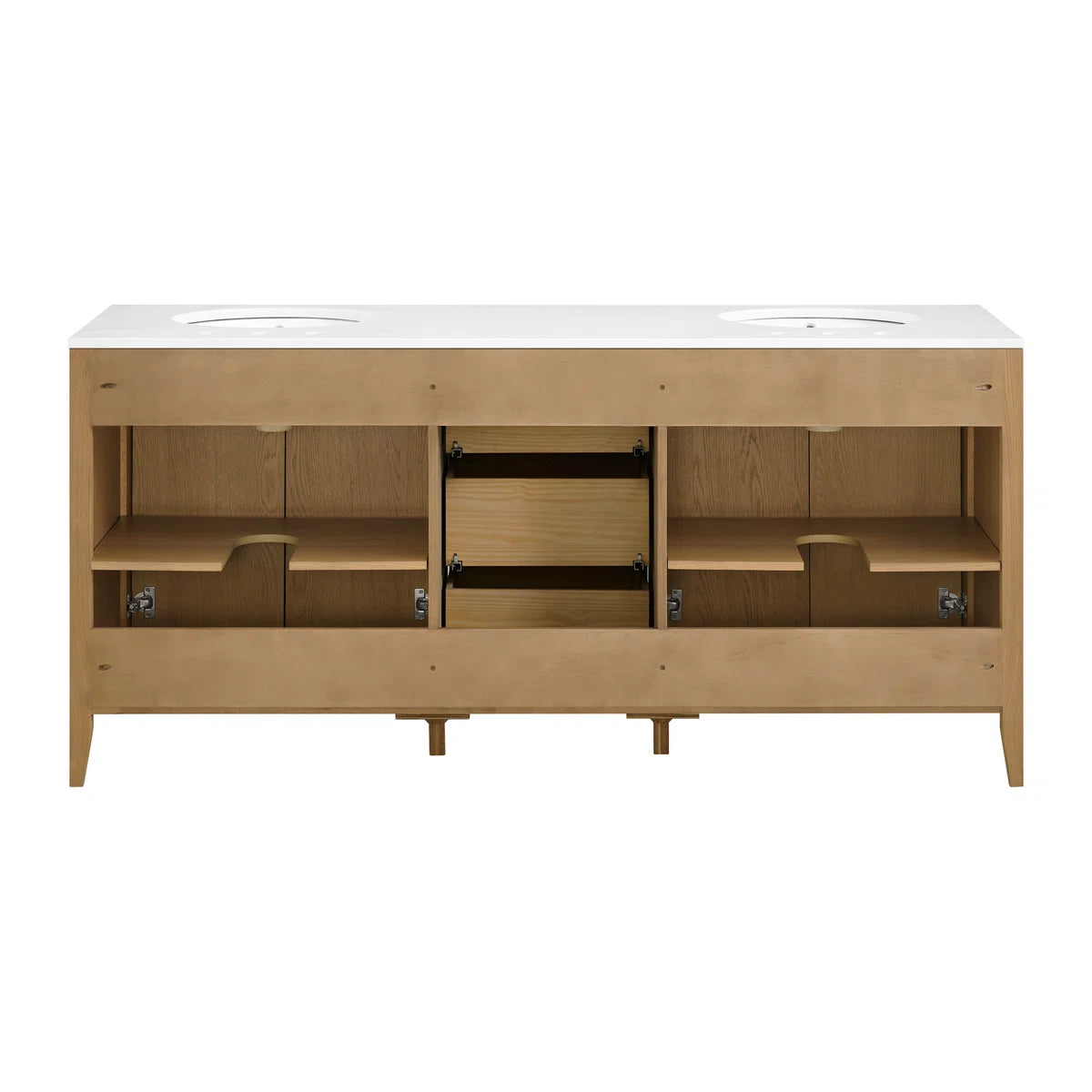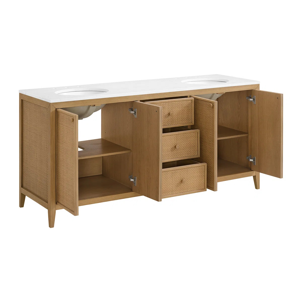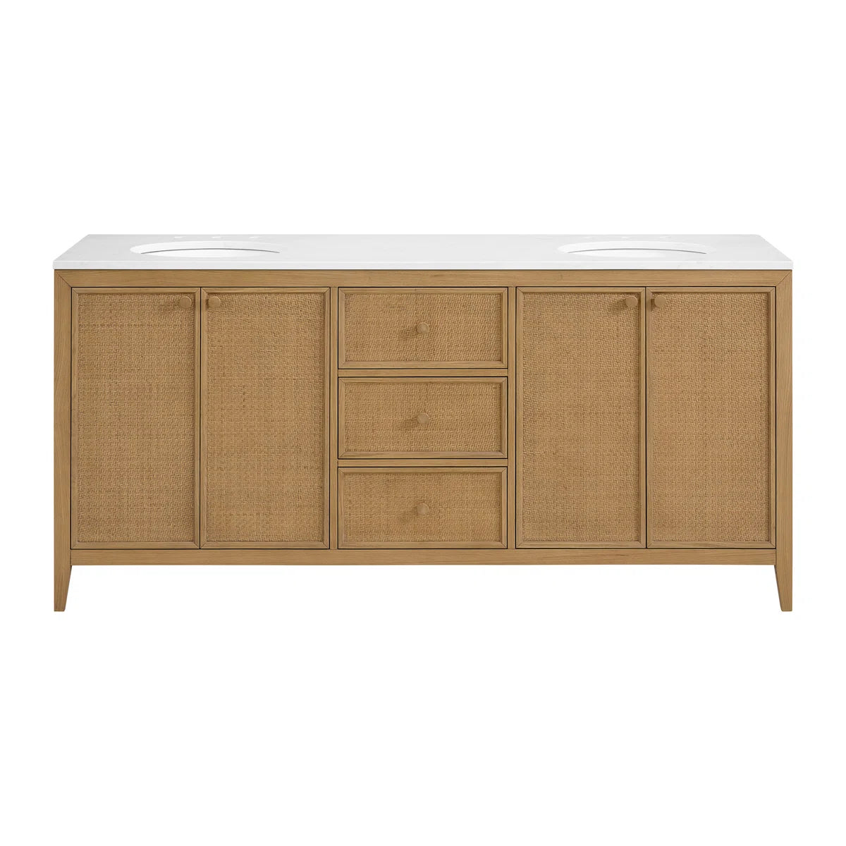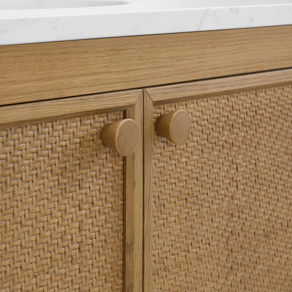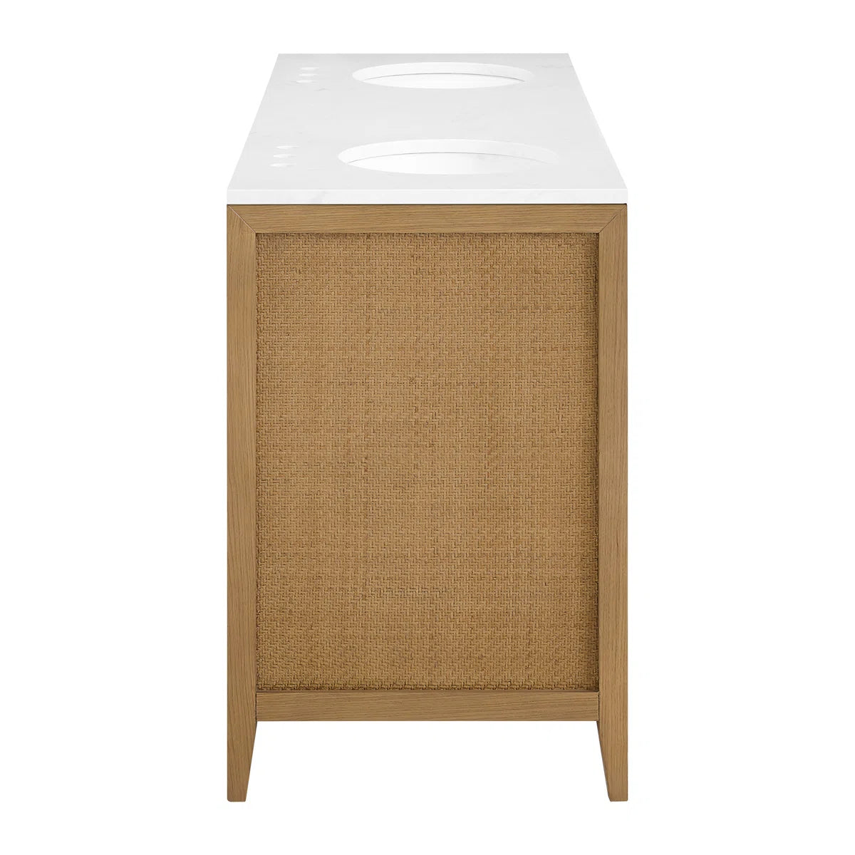 Bring refined coastal elegance to your bathroom with this sophisticated double vanity. The natural cane detailing on the cabinet fronts creates an airy, textural appeal while maintaining a clean-lined silhouette. The engineered marble countertop provides both durability and luxury, complemented by two undermount ceramic sinks for a seamless look.