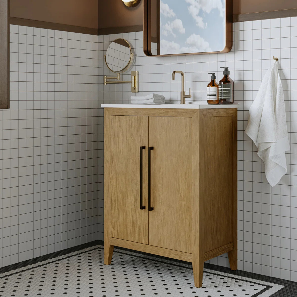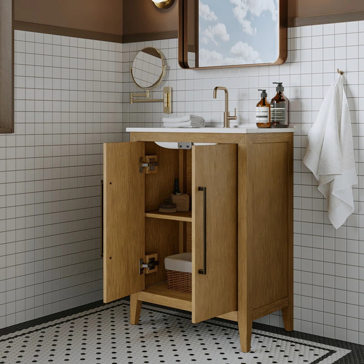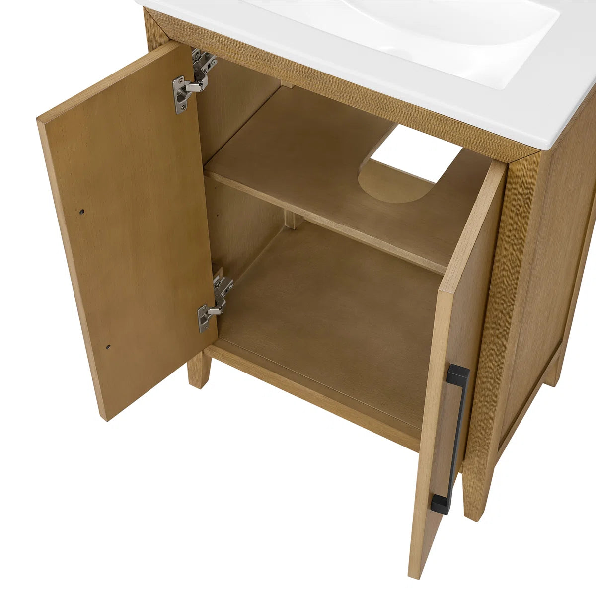 Elevate your bathroom or powder room with the Bergen single small space bathroom vanity, a timeless classic that seamlessly blends into any décor from traditional to modern. This premium 24" wide × 14" deep freestanding vanity features solid wood construction with a multi-step finish, standing on elegant tapered legs for sophisticated appeal. Generous storage includes two cabinet doors with an adjustable shelf, providing ample space for all your bathroom essentials.
