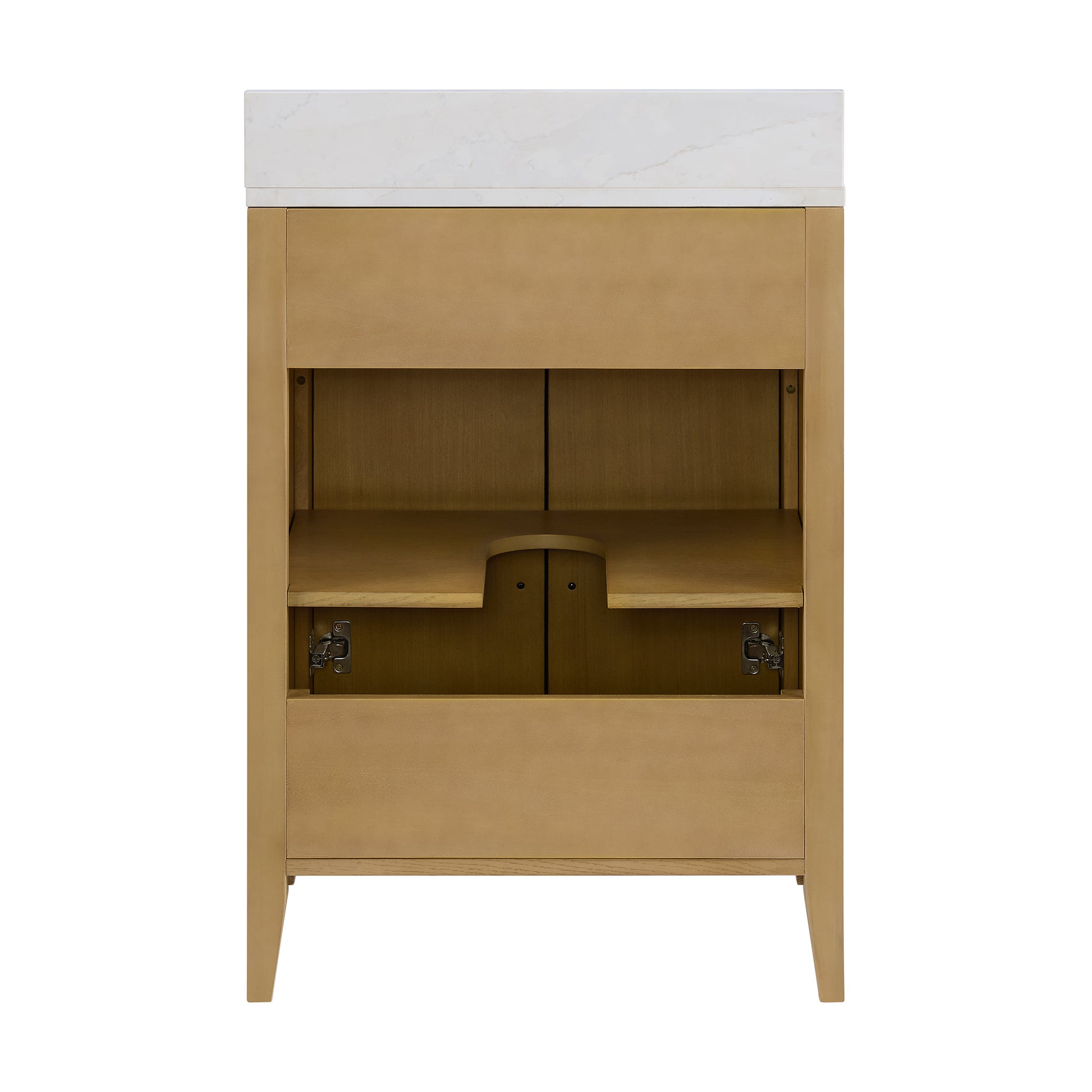Elevate your bathroom with the Alsup single bathroom vanity, a timeless classic that seamlessly blends into any décor from traditional to modern. This premium 24” freestanding vanity features solid wood construction with a multi-step finish, standing on elegant tapered legs for sophisticated appeal. Generous storage includes twin cabinet doors with an adjustable shelf, providing ample space for all your bathroom essentials. Topped with luxurious Calacatta Gold Quartz countertop and a ceramic undermount sink, this designer bathroom furniture combines functionality with enduring quality built to last a lifetime. Faucets sold separately. Simple assembly required.