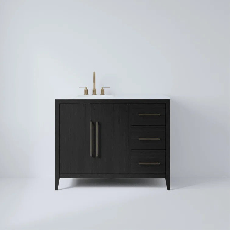 Elevate your space with the Bergen 42-inch freestanding bathroom vanity, crafted from solid wood and oak veneer with a rich multi-step finish. Blending classic and modern design, it features ample storage with three soft-close drawers and two cabinet doors with an adjustable shelf. Finished with a Calacatta Gold Quartz countertop and ceramic undermount sink, this vanity offers timeless style and lasting quality.