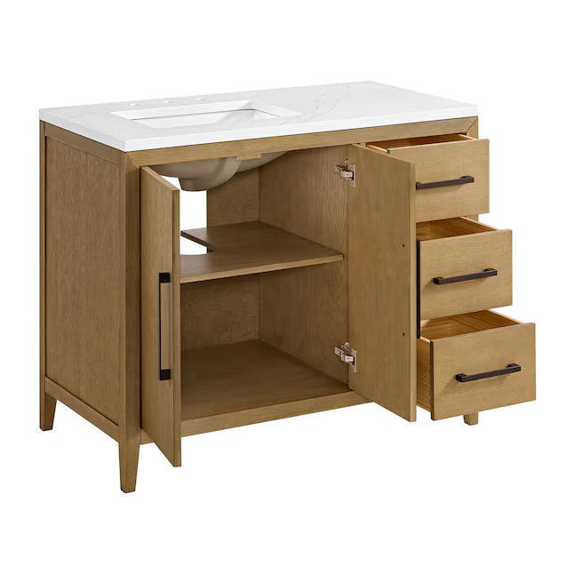 Elevate your space with the Bergen 42-inch freestanding bathroom vanity, crafted from solid wood and oak veneer with a rich multi-step finish. Blending classic and modern design, it features ample storage with three soft-close drawers and two cabinet doors with an adjustable shelf. Finished with a White Statuario Quartz countertop and ceramic undermount sink, this vanity offers timeless style and lasting quality.