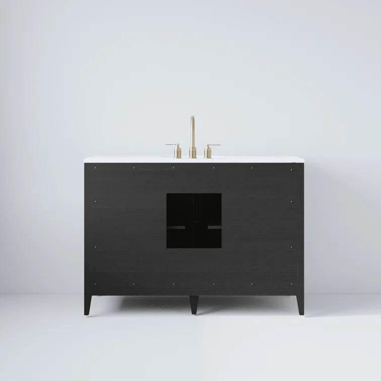 Enhance your bathroom with the Bergen single vanity, a versatile piece that compliments both traditional and modern styles. This 48-inch freestanding vanity is crafted from solid wood with a detailed multi-step finish and rests on stylish tapered legs for a refined look. It offers ample storage through six soft-close drawers and two cabinet doors with adjustable shelves, perfect for organizing your essentials. The vanity is topped with a durable Calacatta Gold Quartz countertop and a ceramic undermount sink, combining practical design with lasting quality.