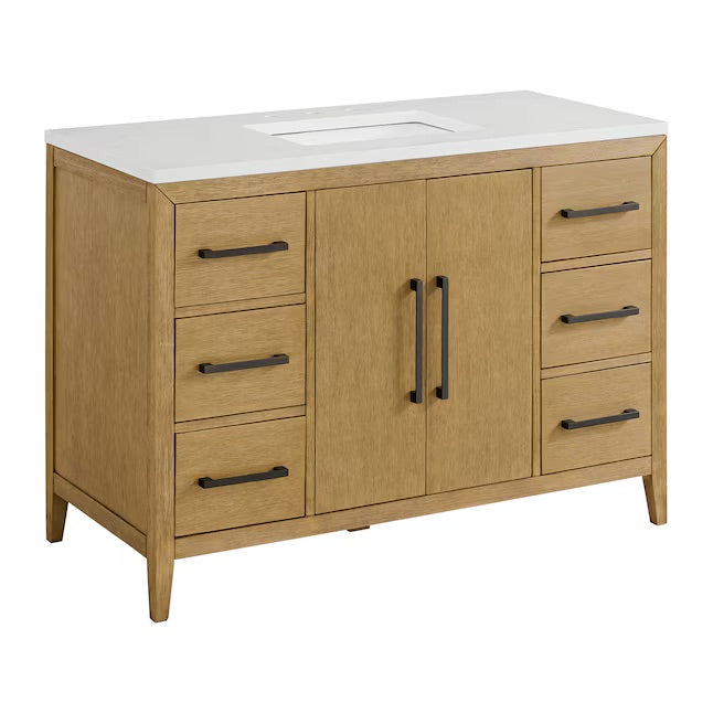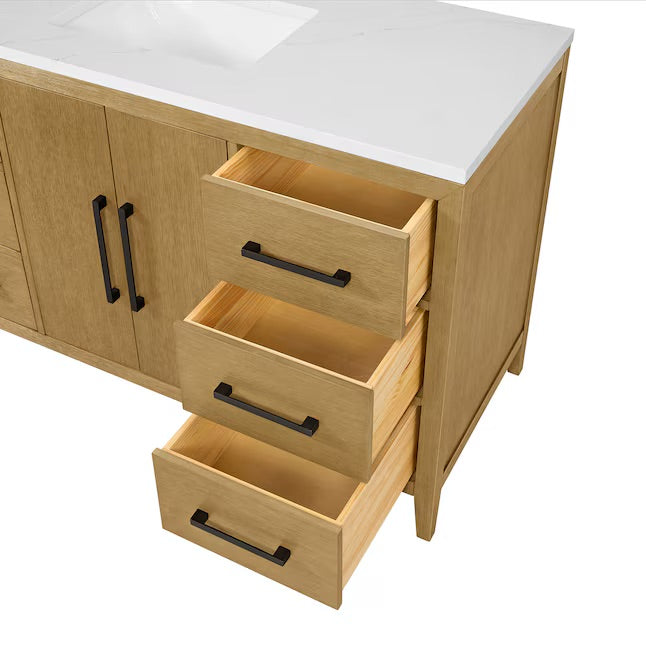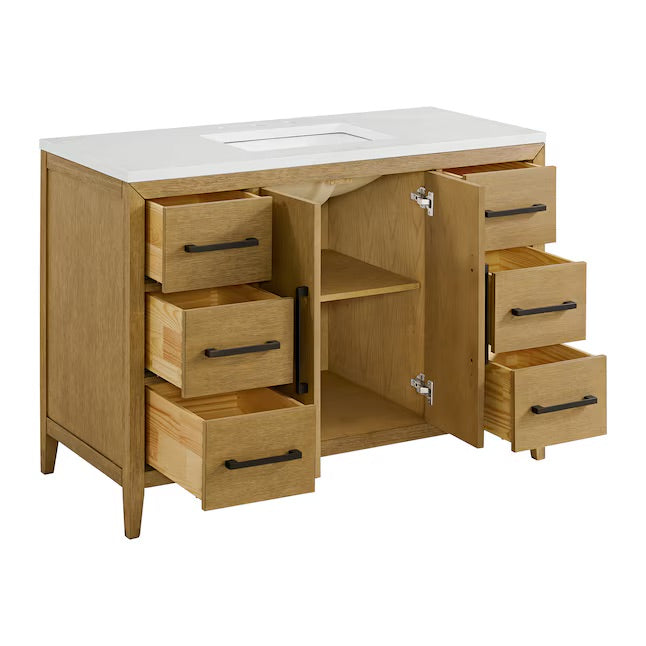 Elevate your space with the Bergen 48-inch freestanding bathroom vanity, crafted from solid wood and oak veneer with a rich multi-step finish. Blending classic and modern design, it features ample storage with six soft-close drawers and two cabinet doors with an adjustable shelf. Finished with a White Statuario Quartz countertop and ceramic undermount sink, this vanity offers timeless style and lasting quality.