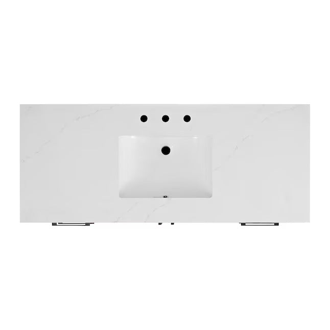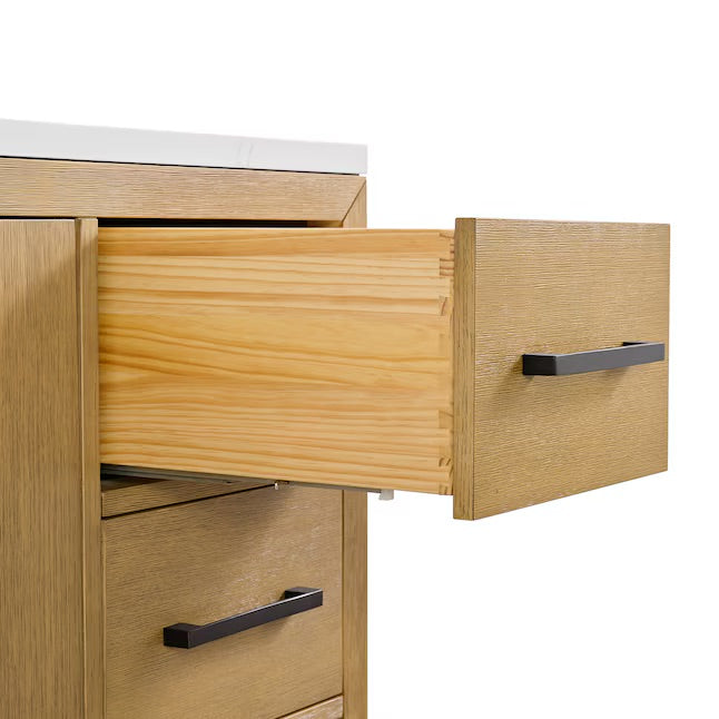 Elevate your space with the Bergen 54-inch freestanding bathroom vanity, crafted from solid wood and oak veneer with a rich multi-step finish. Blending classic and modern design, it features ample storage with six soft-close drawers and two cabinet doors with an adjustable shelf. Finished with a White Statuario Quartz countertop and ceramic undermount sink, this vanity offers timeless style and lasting quality.