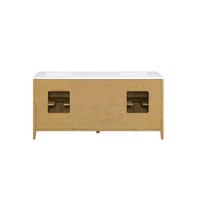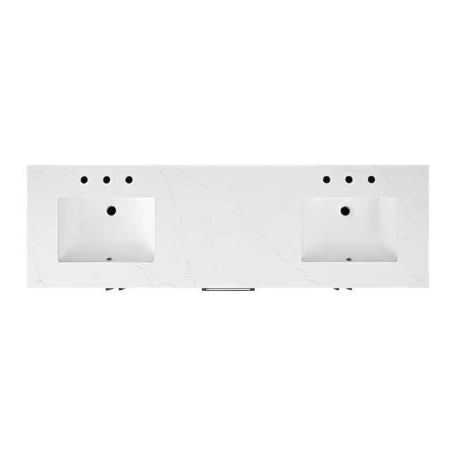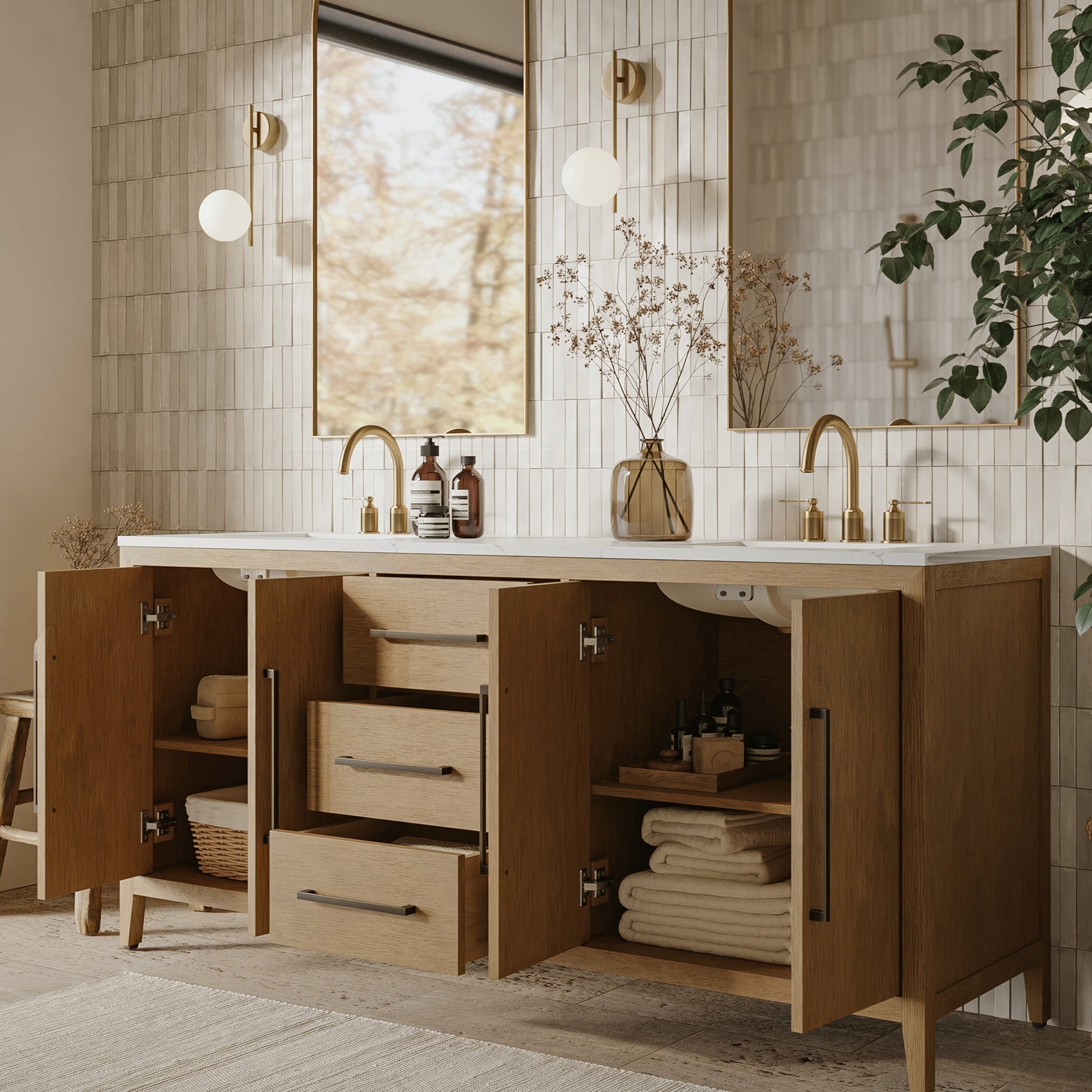 Enhance the style of your bathroom with this elegant double vanity. The freestanding vanity measures 72'' wide and boasts a solid wood frame and rich wood stain over real oak veneers. The soft-close cabinet doors below each sink conveniently open to reveal a shelved area for storing linens and cleaning products. Three soft-close drawers offer ample space for toiletries, washcloths, and other essential bathroom items. This vanity also includes a stunning quartz countertop and two ceramic sinks.