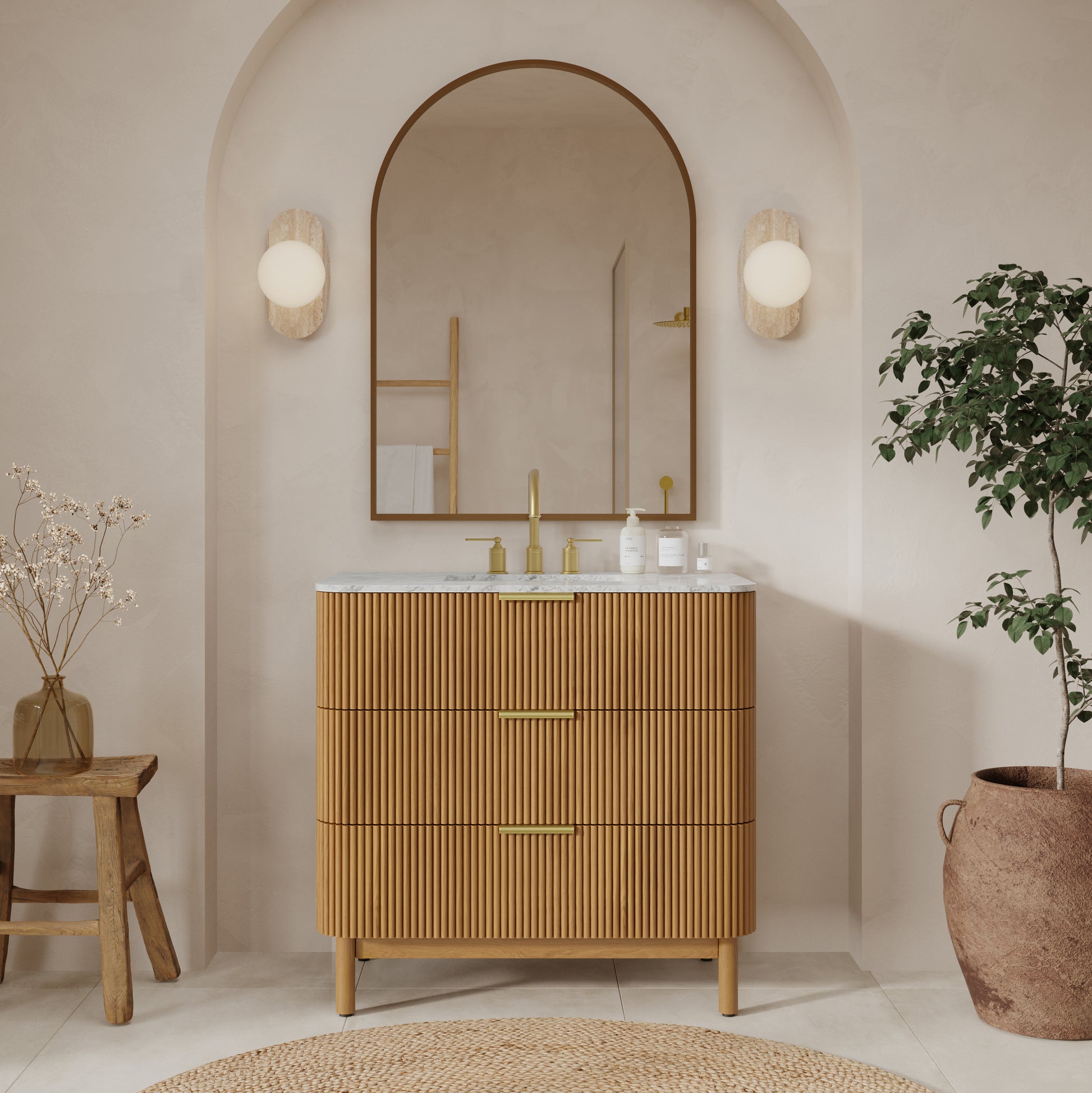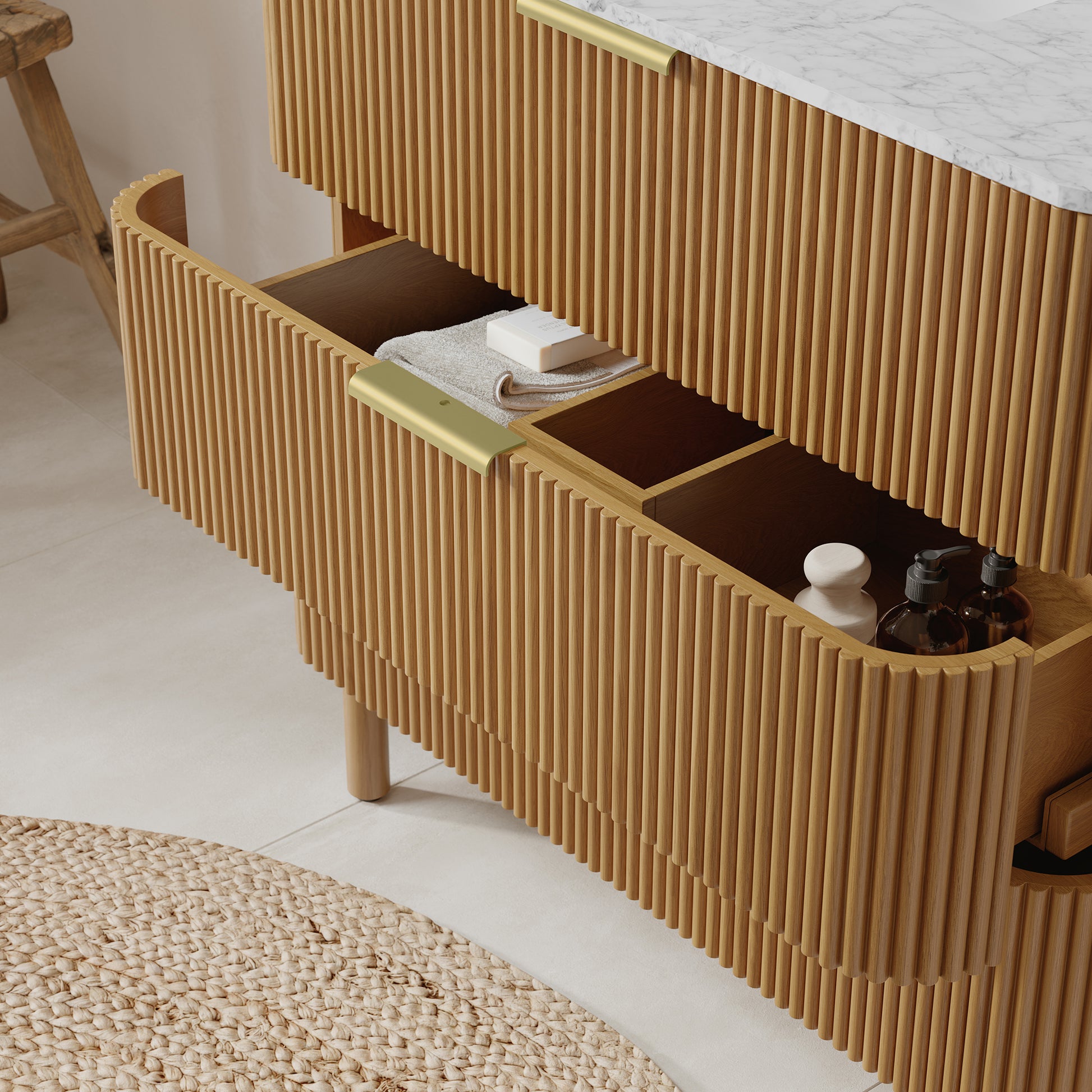 Create a stunning focal point with our luxury reeded vanity, featuring a modern Carrara Marble countertop and high-end, textured cabinetry. The Reeded Birch finish offers a warm Golden Honey tone that brightens your space with natural radiance. This freestanding piece delivers premium storage with soft-close drawers and doors and durable furniture grade construction, making it the perfect upgrade for any primary bathroom or powder room.