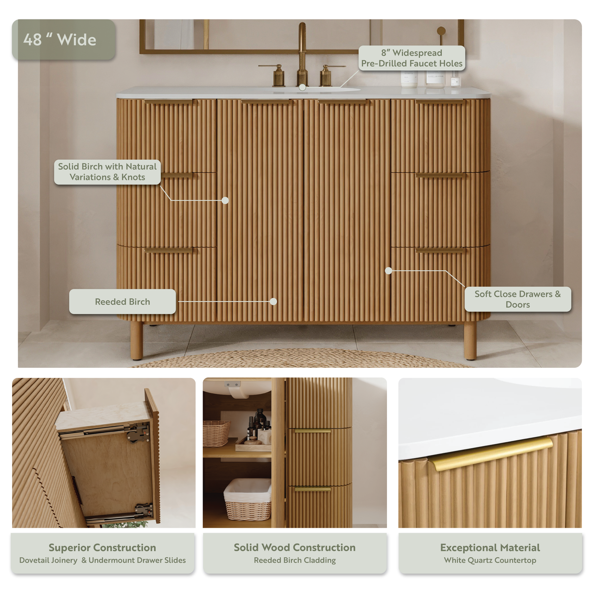 Create a stunning focal point with our luxury reeded vanity, featuring a modern White Quartz countertop and high-end, textured cabinetry. The Reeded Birch finish offers a warm Golden Honey tone that brightens your space with natural radiance. This freestanding piece delivers premium storage with soft-close drawers and doors and durable furniture grade construction, making it the perfect upgrade for any primary bathroom.