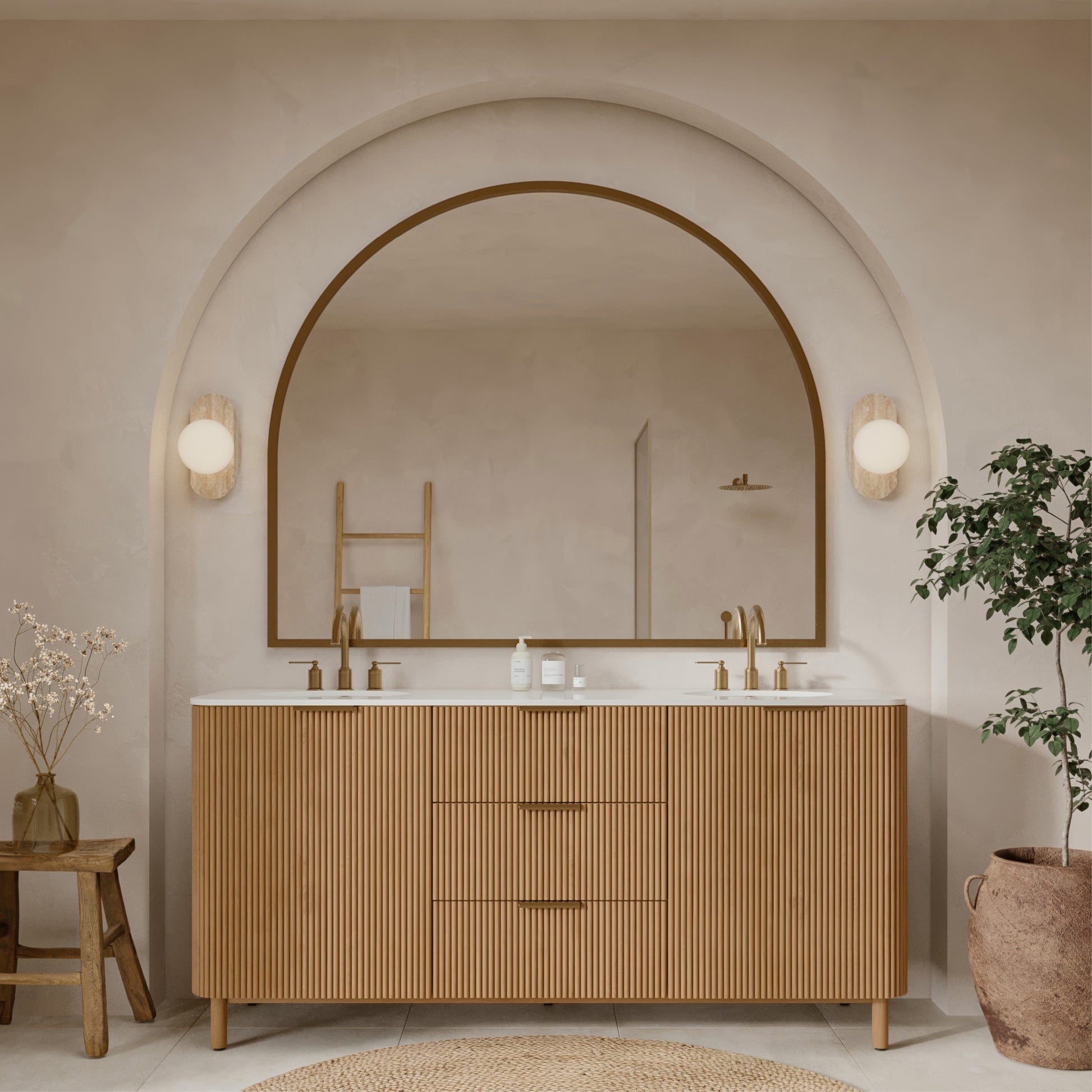 Create a stunning focal point with our luxury reeded vanity, featuring a modern White Quartz countertop and high-end, textured cabinetry. The Reeded Birch finish offers a warm Golden Honey tone that brightens your space with natural radiance. This freestanding piece delivers premium storage with soft-close drawers and doors and durable furniture grade construction, making it the perfect upgrade for any primary bathroom.