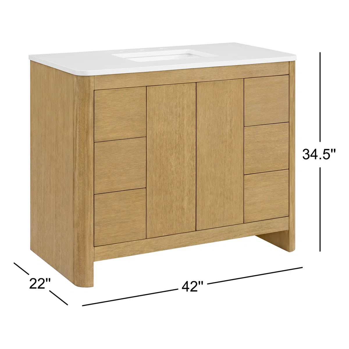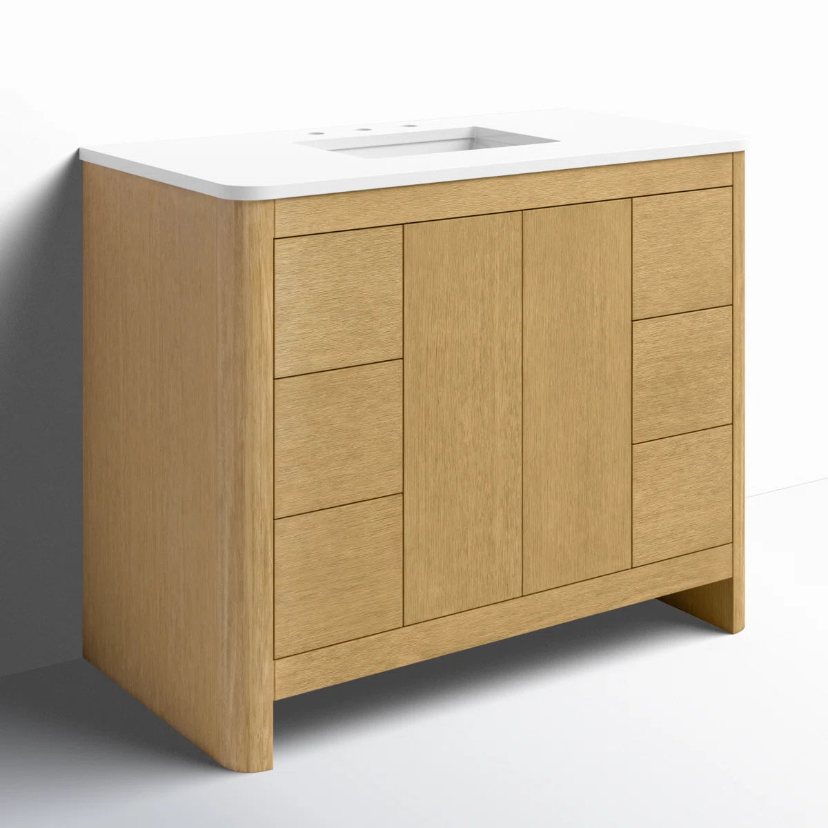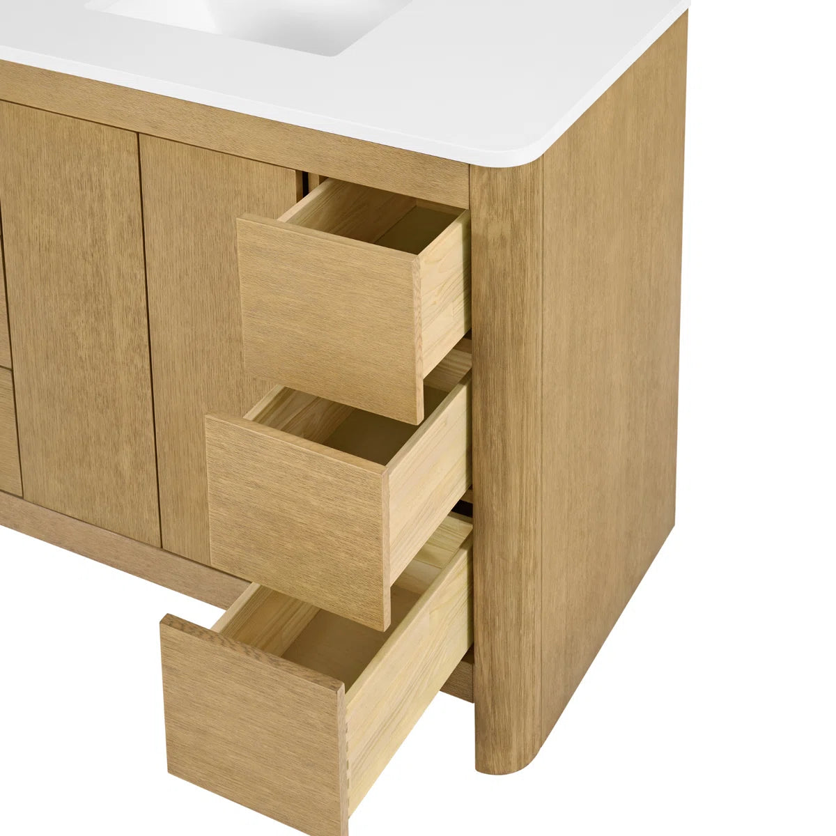 This freestanding single vanity set combines functionality with rustic elegance, making it a great addition to your bathroom. It features a white quartz countertop that offers a sleek, modern look while providing a durable surface for your daily routine. Its light wire-brushed oak base, crafted from a blend of solid and engineered wood, adds a natural element with purposeful distressing for a bit of character. With six push-to-open drawers and adjustable shelves, you'll have plenty of space to keep your essentials organized. The square ceramic sink is centrally located, ready for your choice of an 8" widespread faucet.