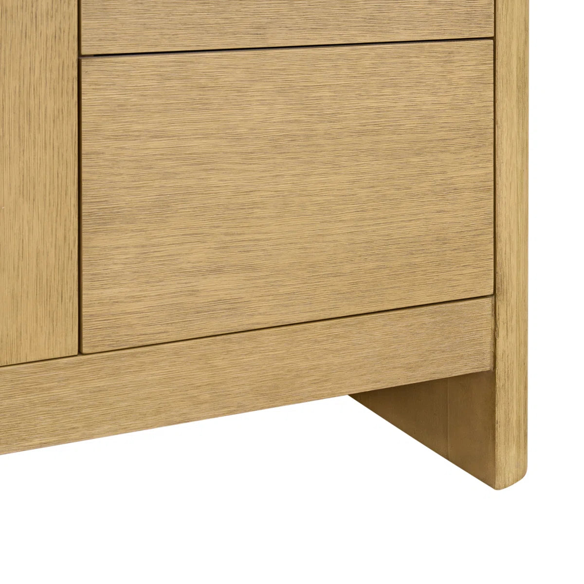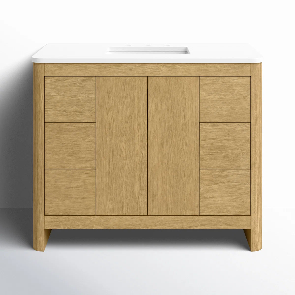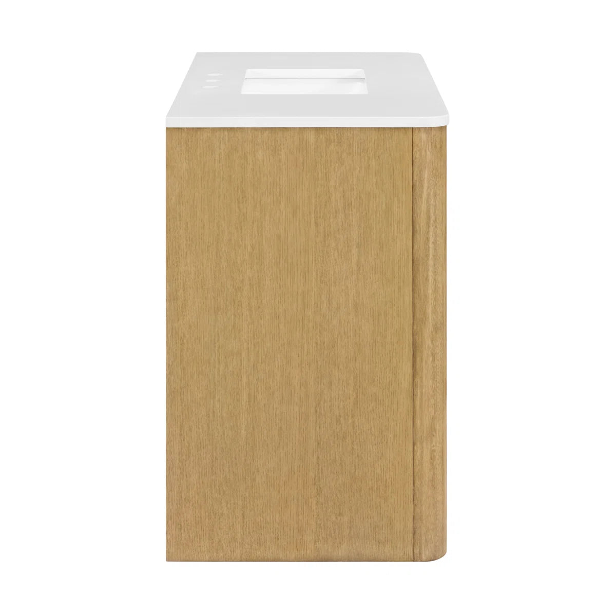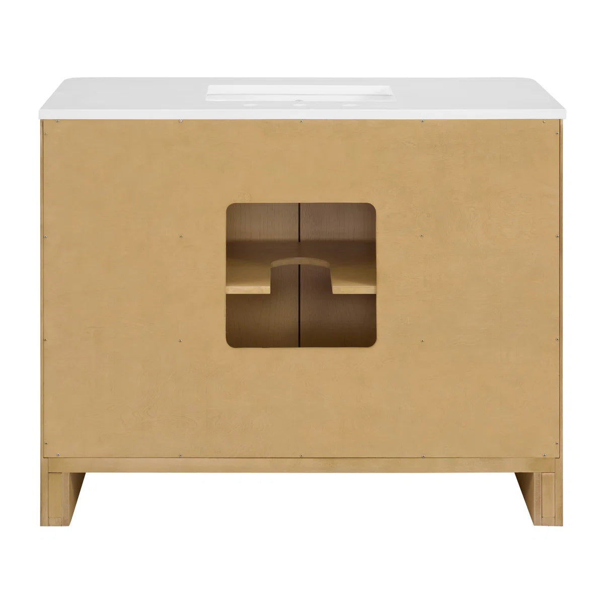This freestanding single vanity set combines functionality with rustic elegance, making it a great addition to your bathroom. It features a white quartz countertop that offers a sleek, modern look while providing a durable surface for your daily routine. Its light wire-brushed oak base, crafted from a blend of solid and engineered wood, adds a natural element with purposeful distressing for a bit of character. With six push-to-open drawers and adjustable shelves, you'll have plenty of space to keep your essentials organized. The square ceramic sink is centrally located, ready for your choice of an 8" widespread faucet.