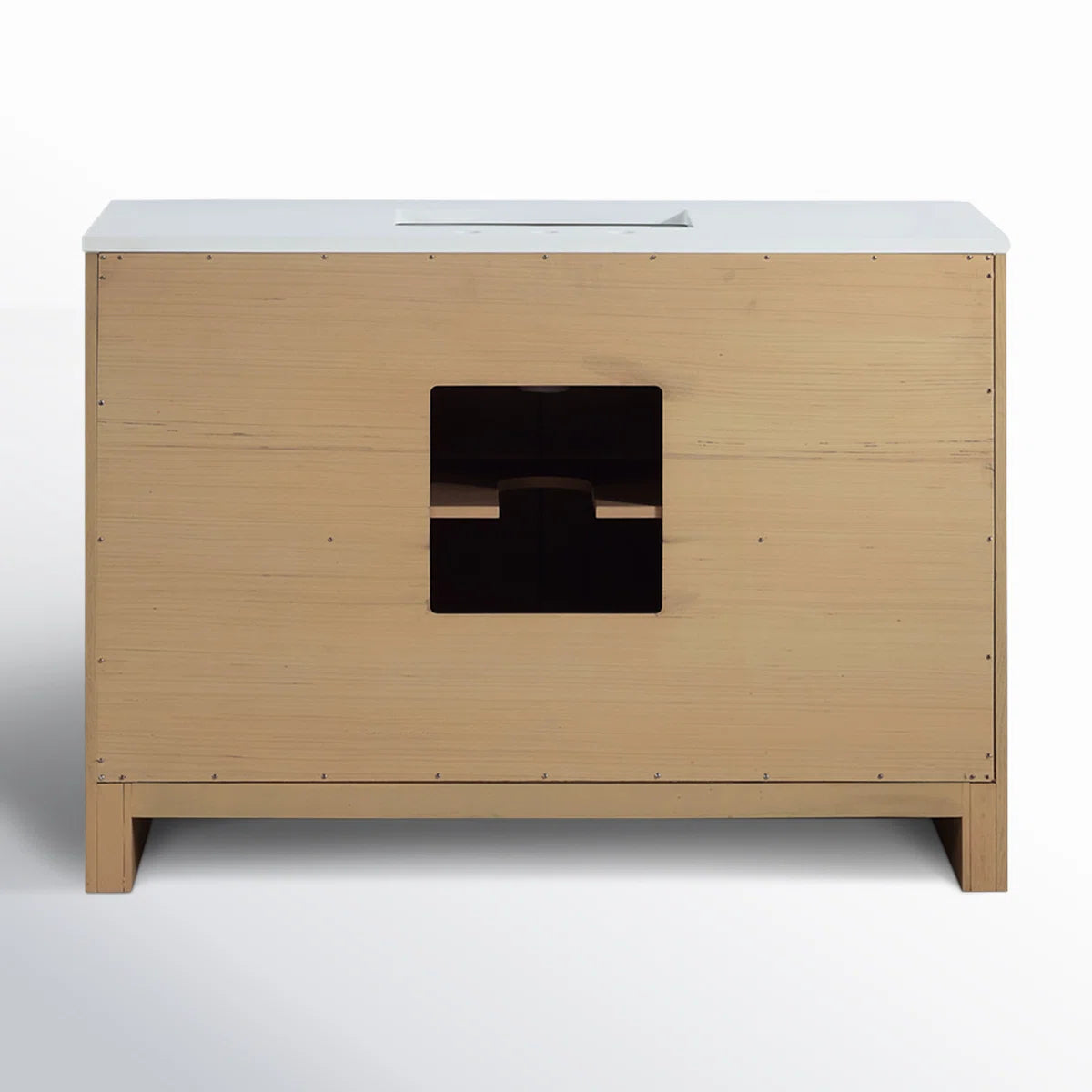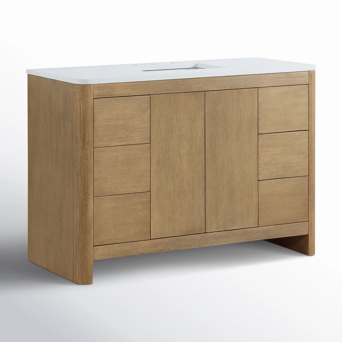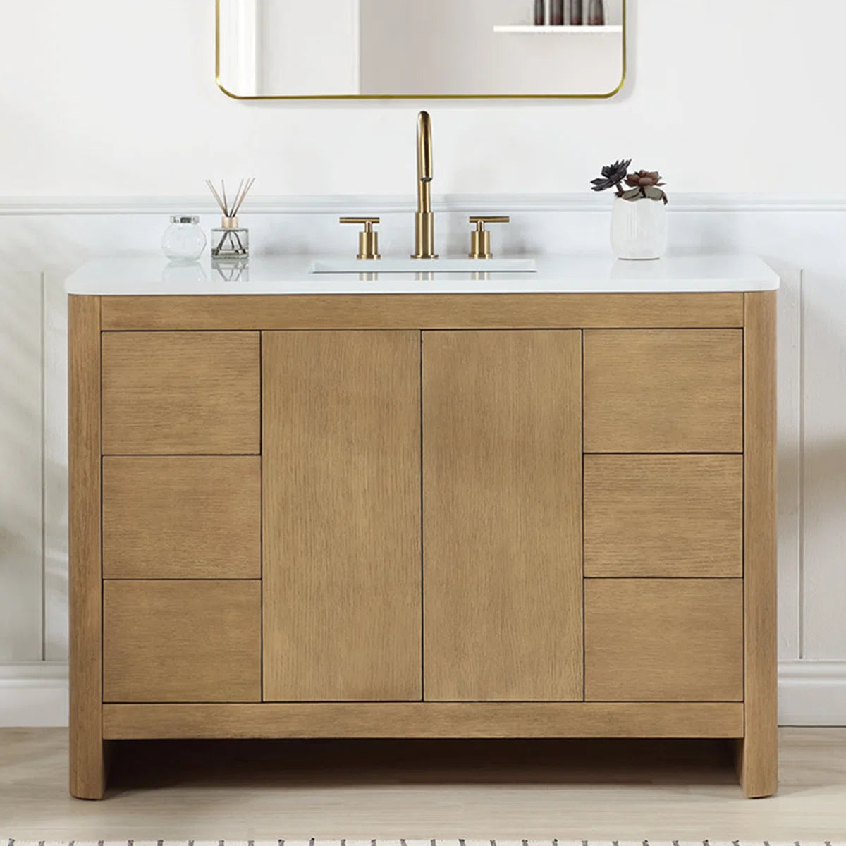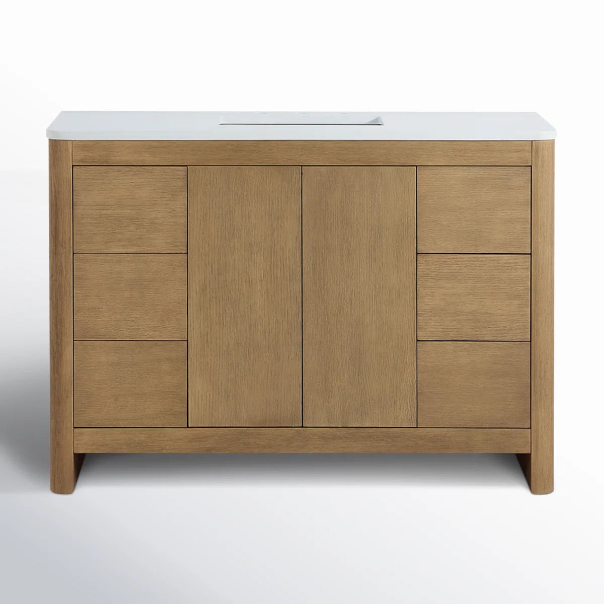 This single bathroom vanity offers a blend of modern style and practical features, making it a focal point in any bathroom. The pure white quartz top is sleek and stain-resistant, while the clean-lined, beige wooden base showcases hand-distressed details. It includes a ceramic undermount sink and six push-to-open drawers for convenient storage. An extra shelf in the cabinet provides additional space for organizing all of your essentials. Sold separately: P-Trap, mounting bracket, faucet, drain assembly, and backsplash.