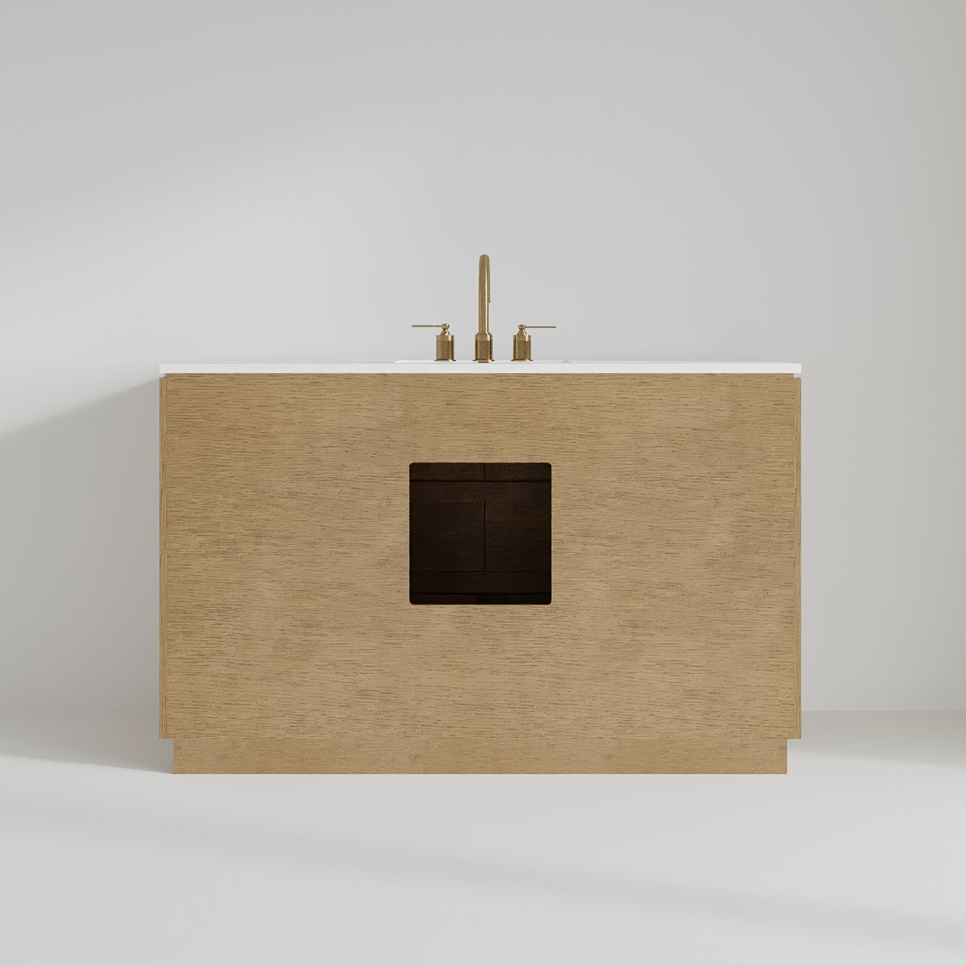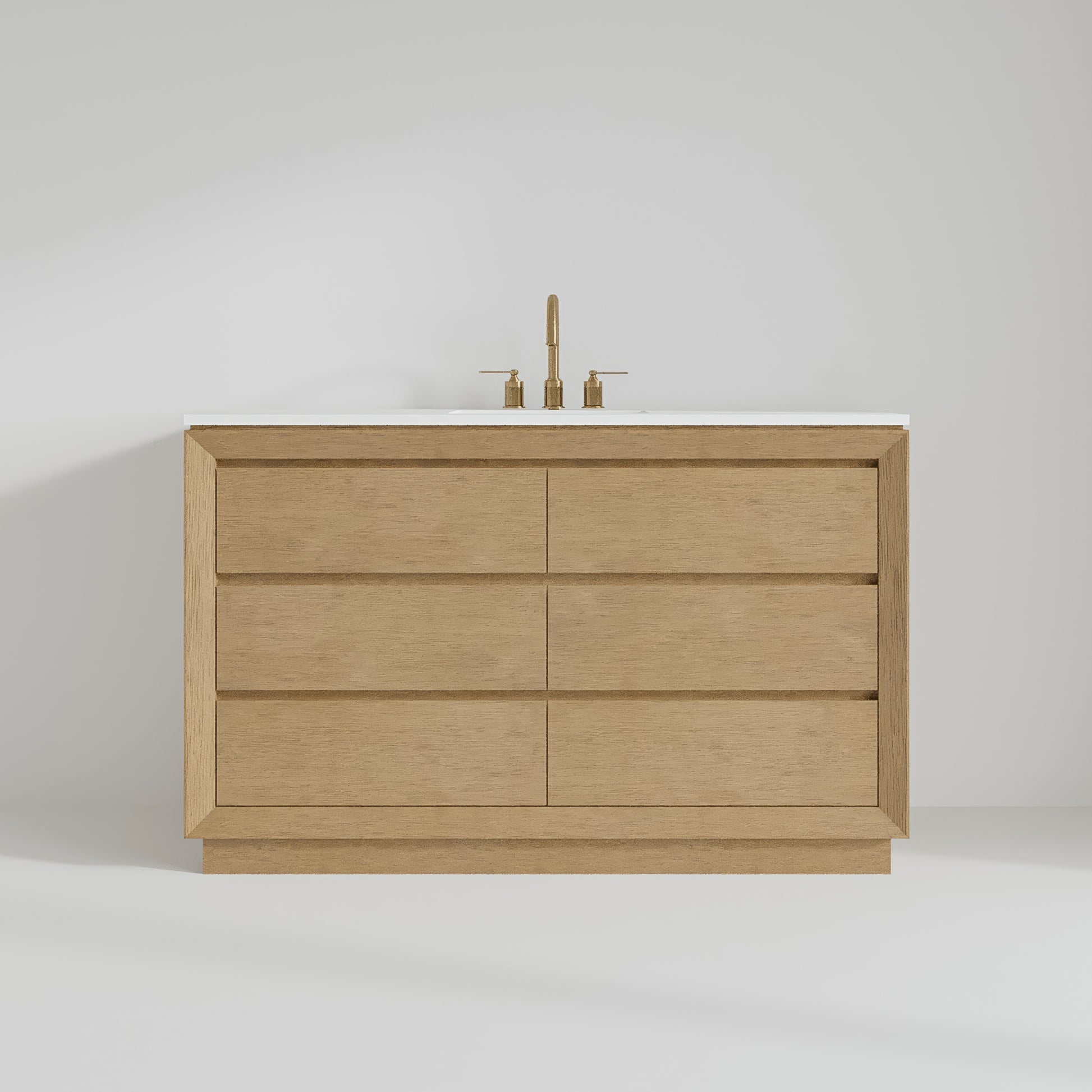 Introducing our sleek and modern 54-inch bathroom vanity, perfect for elevating your bathroom decor to the next level. Featuring six soft-close under-mount drawers, your bathroom essentials are always within reach. Real oak veneers are wire brushed and finished with multiple layers of stain to bring out the natural beauty of the wood.