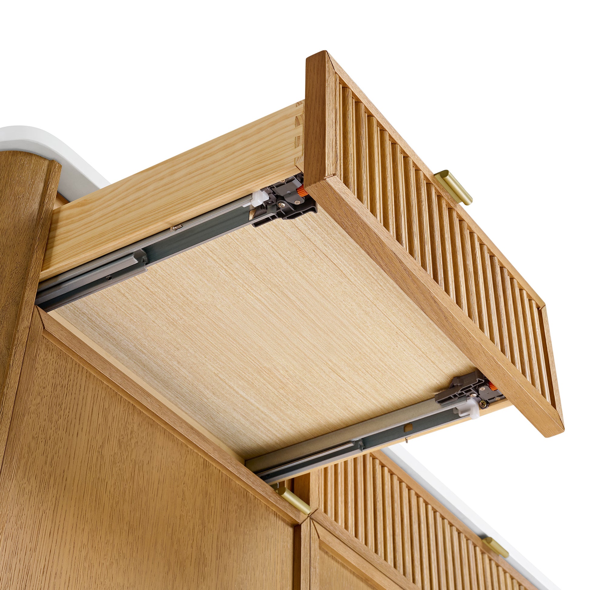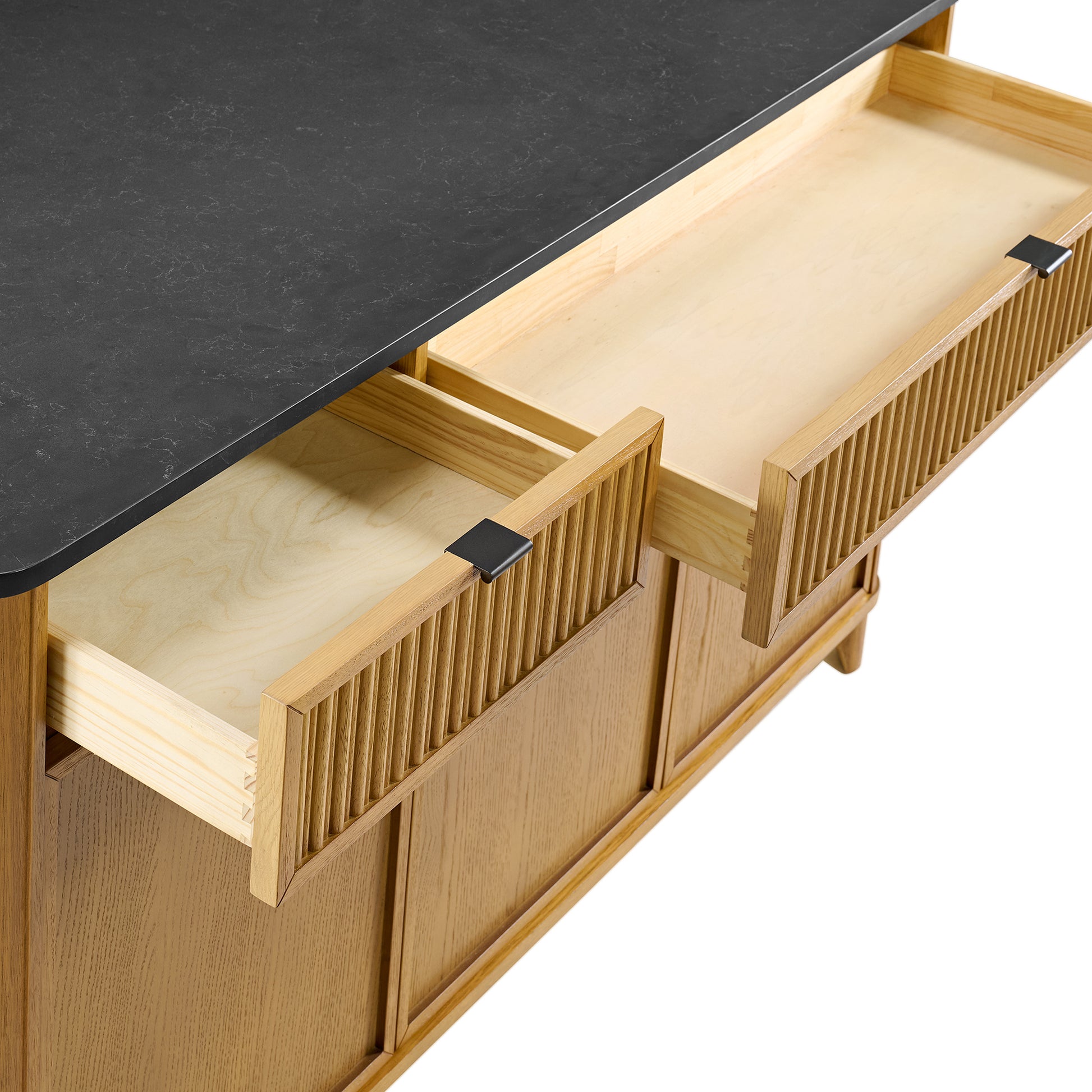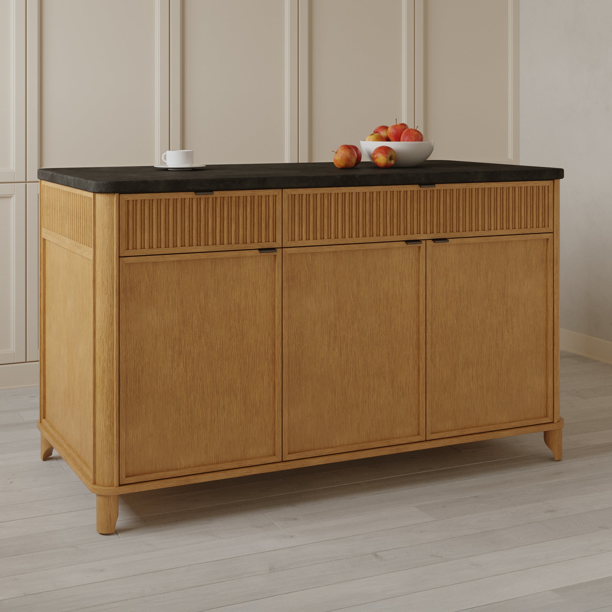 Bring timeless sophistication to the heart of your home with the Kathryn Collection-Top Kitchen Island. Crafted from solid wood with oak veneers and topped in your choice of solid or this elegant centerpiece combines refined style with everyday practicality. Thoughtfully designed with function and form in mind, the island offers ample storage for cookware, serveware, and small appliances. Deep drawers neatly organize utensils, linens, and tools. The spacious 60" version accommodates counter-height stools, transforming the island into a casual dining space or prep station. Traditional detailing—like reeded drawer fronts, rounded corners, and beaded accents—adds classic charm, while modern construction features ensure long-lasting performance. Soft-close drawers, premium undermount glides, and dovetail joinery deliver smooth, durable operation. The multi-step oak finish enhances the natural grain of the wood, bringing warmth and richness to your kitchen. With a choice of countertop finishes, this island is designed to complement a wide range of kitchen palettes—from modern minimalism to cozy farmhouse. This multi-functional piece is ideal for farmhouse, transitional, and modern kitchens alike, offering both visual appeal and practical storage in one fully assembled package.