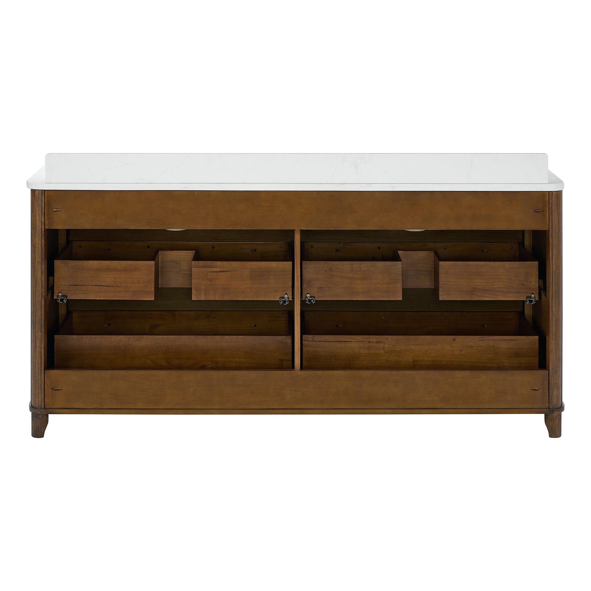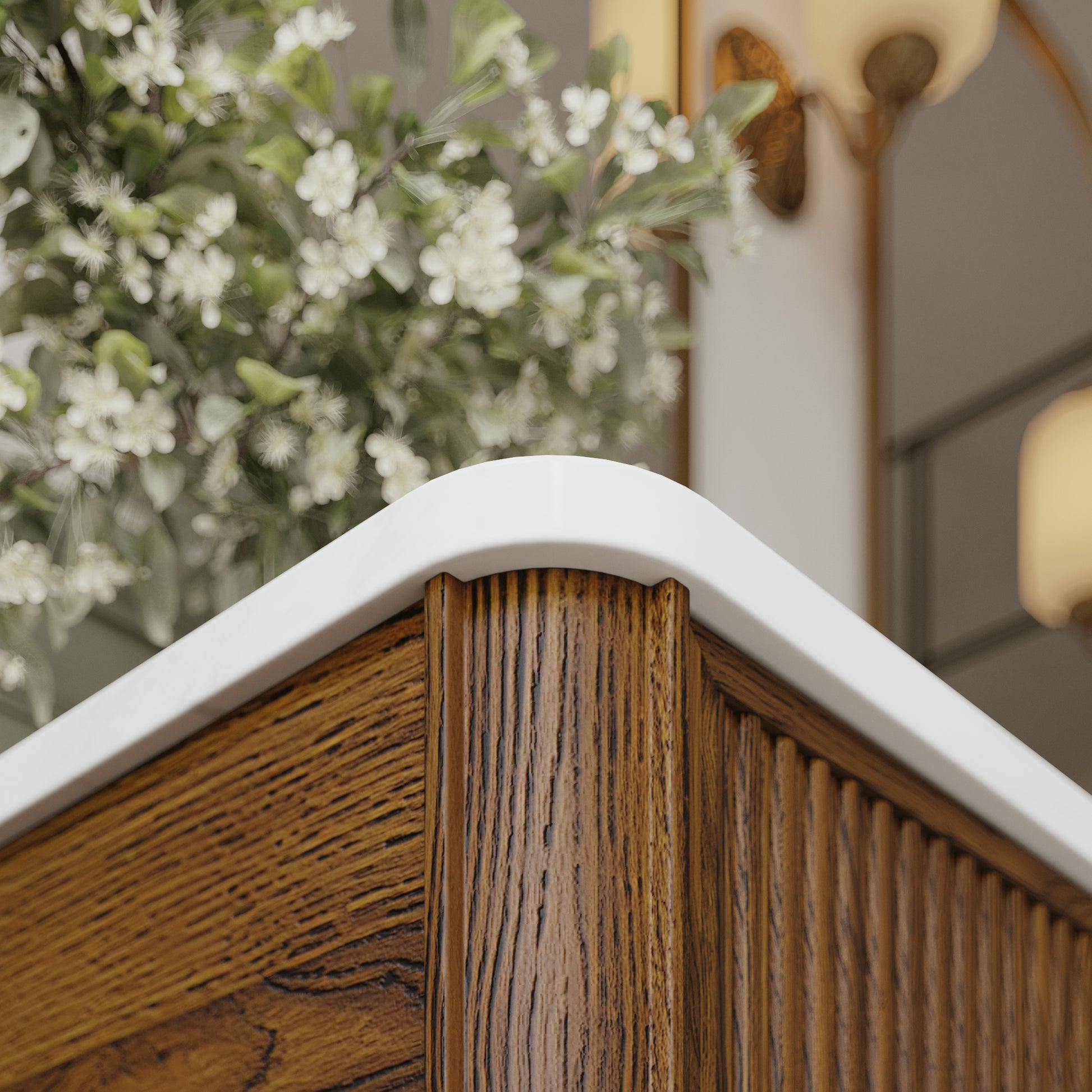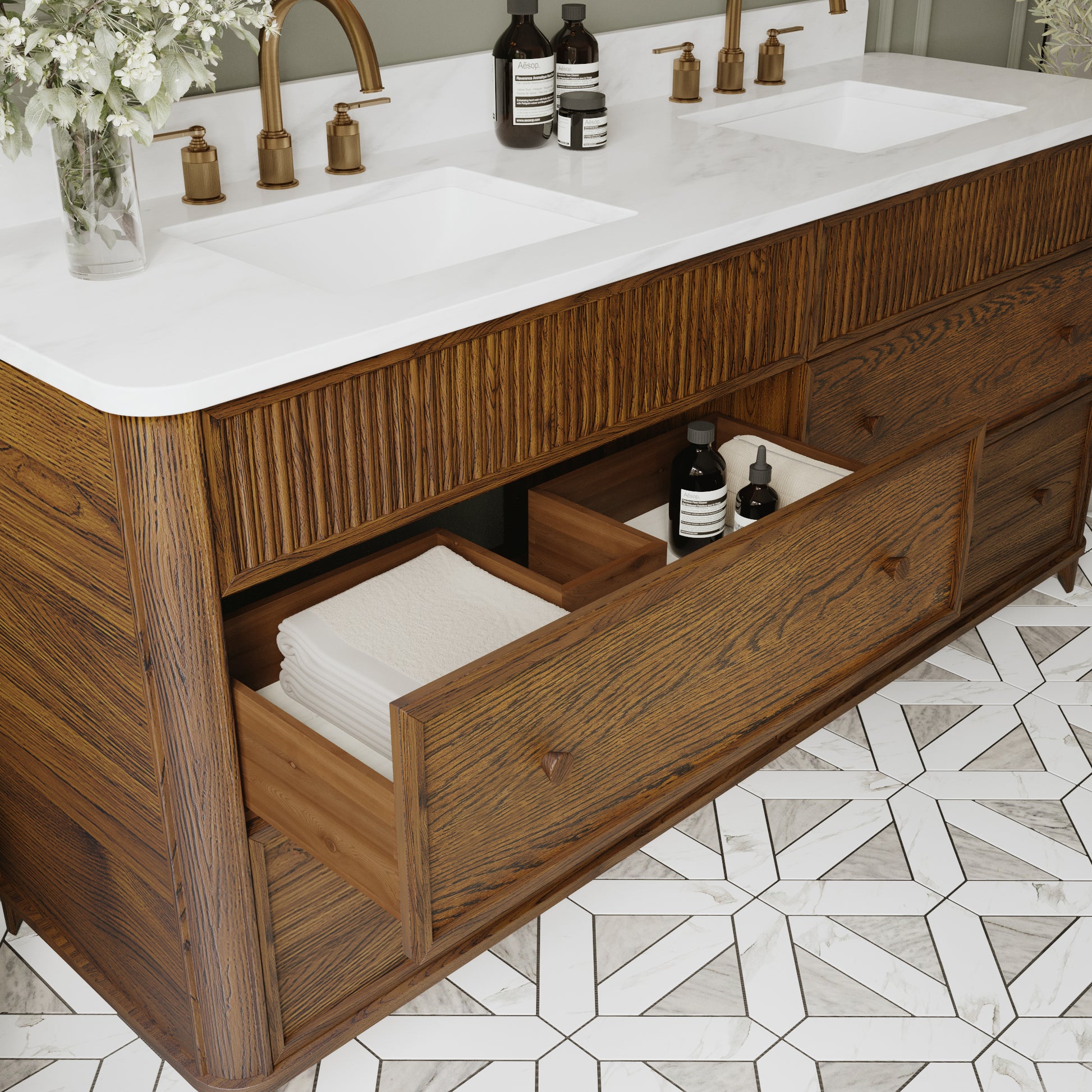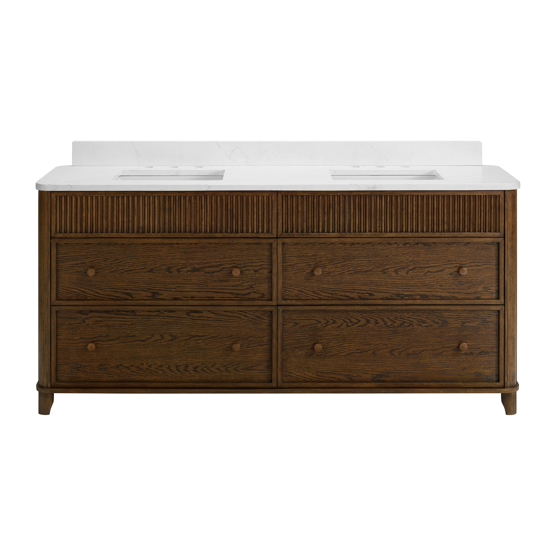 Transform your bathroom with the timeless elegance of the Kathryne Collection Bathroom Vanity. Crafted from solid wood with rich oak veneers and solid oak trim, this vanity delivers a perfect blend of classic design and modern functionality. Topped with authentic Statuario quartz, each vanity features a seamless undermount ceramic sink for a refined and clean look. The front showcases artisanal details such as a reeded front, rounded corners and beading drawing inspiration from vintage furniture design while maintaining a versatile aesthetic that suits farmhouse, transitional, or contemporary bathrooms. The warm oak finsh is achieved through a meticulous multistep process that highlights the natural wood grain. With soft-close drawers, furniture-grade dovetail joinery, and hand-turned solid oak knobs, this vanity offers both durability and luxury. Available in multiple sizes, single and double sink configurations, it's ideal for master baths, guest bathrooms, and powder rooms alike.