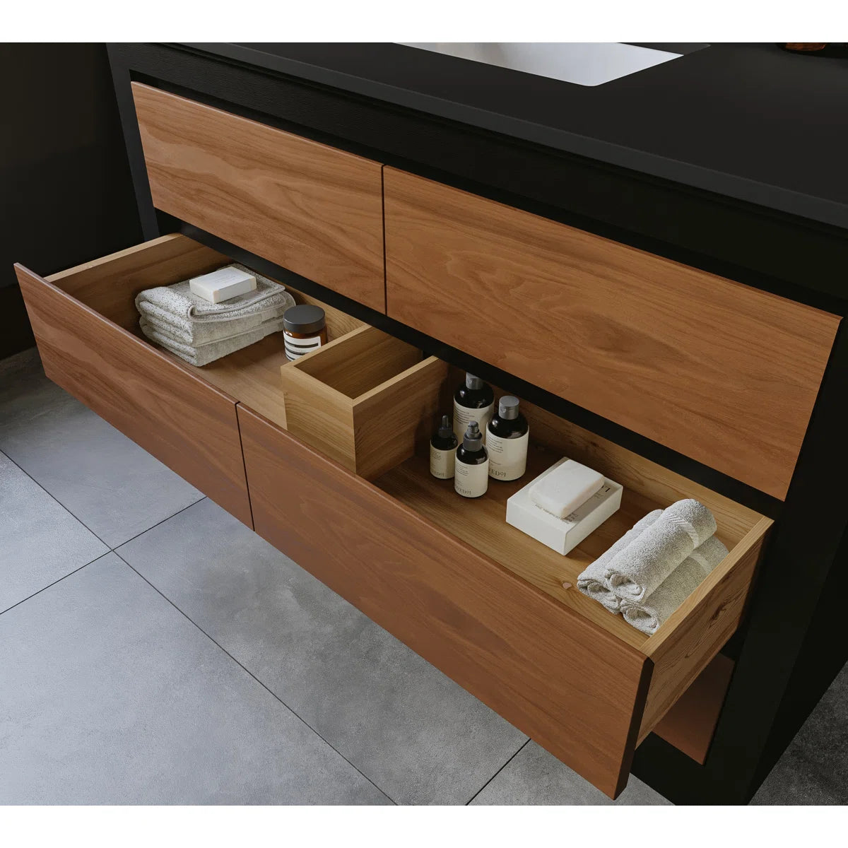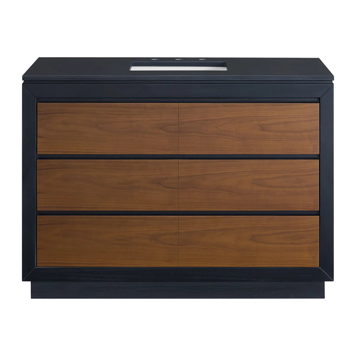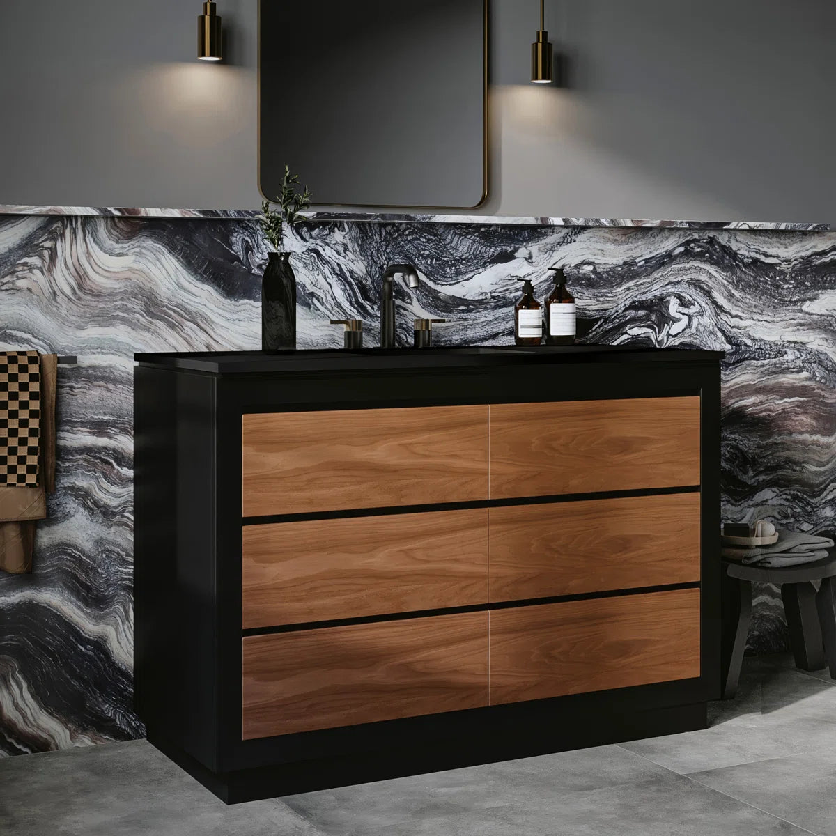Introducing our sleek and modern 48-inch bathroom vanity, perfect for elevating your bathroom decor to the next level. Featuring three large soft-close under-mount drawers, your bathroom essentials are always within reach. The black and walnut contrast finish adds a beautiful modern touch to any bathroom