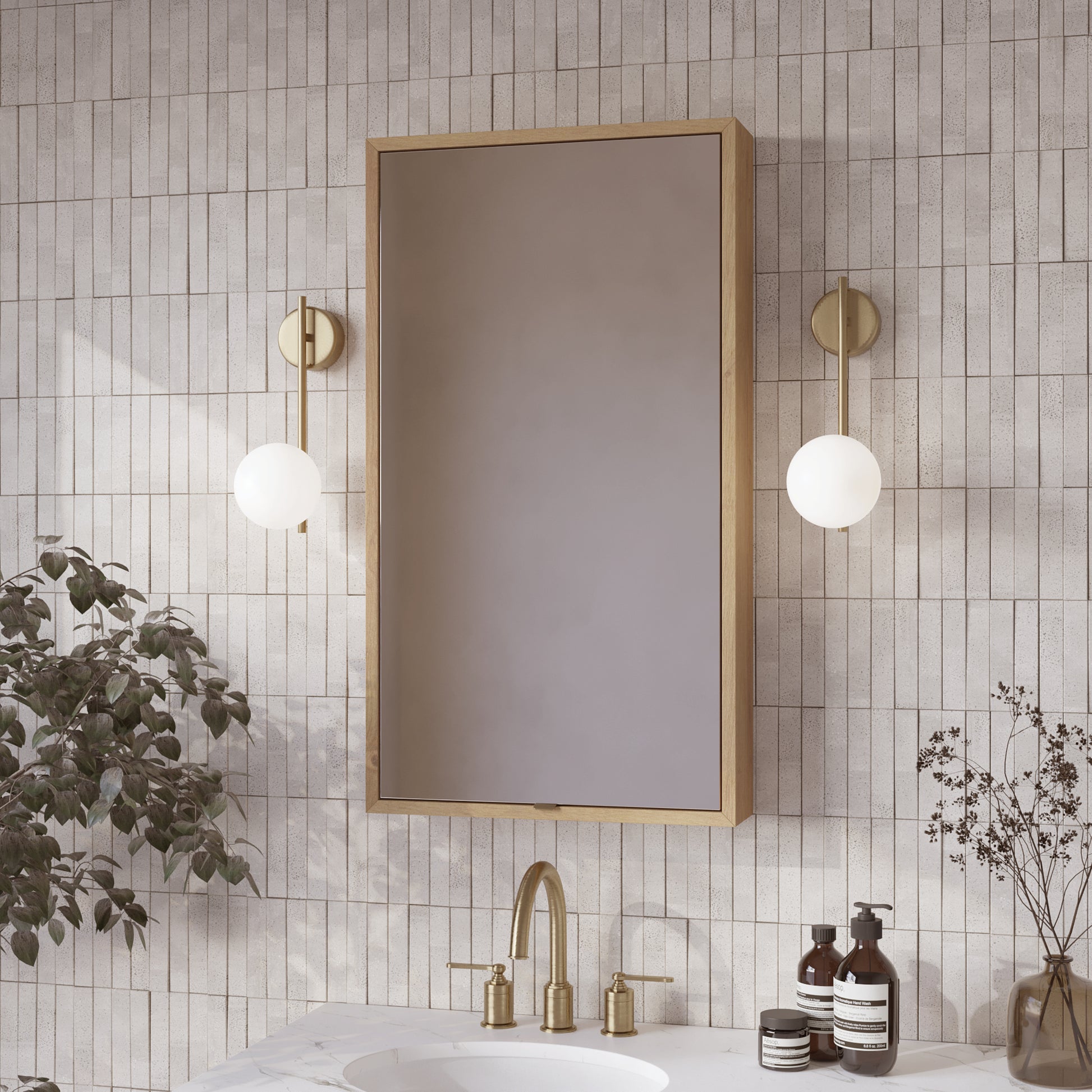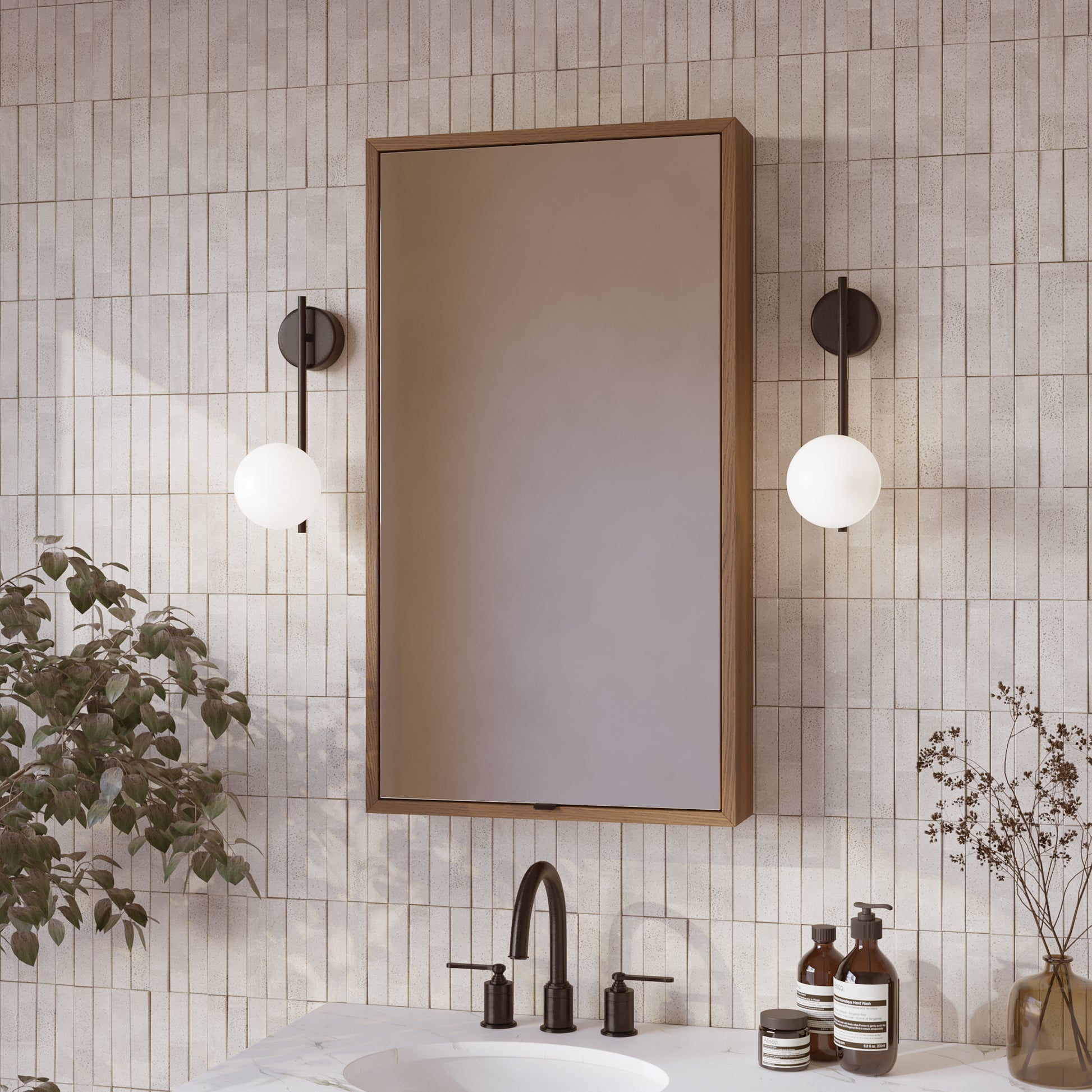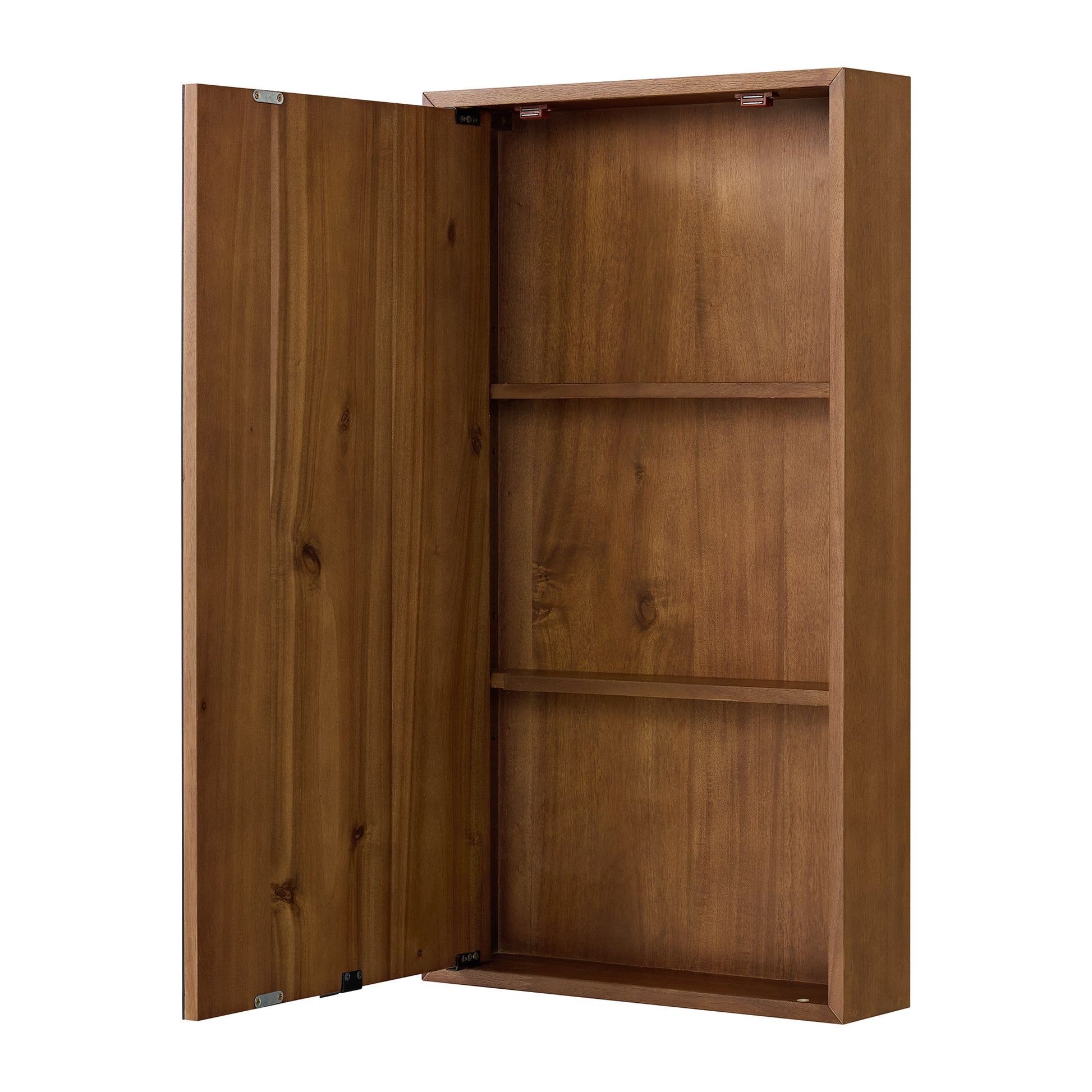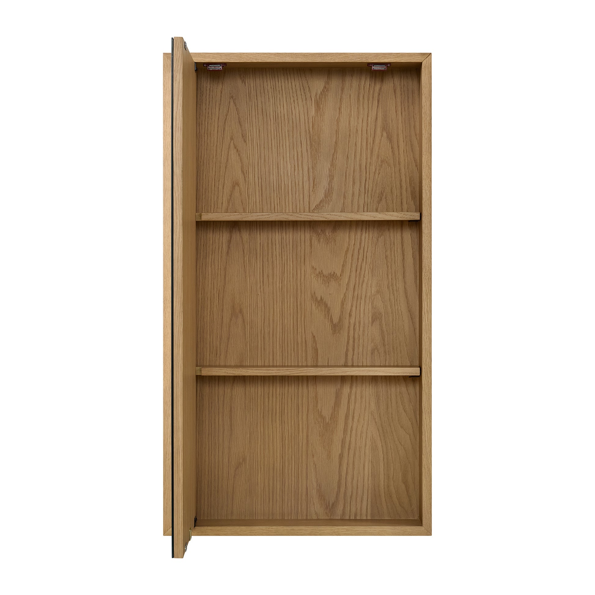 Bring clean lines and smart storage to your bathroom with the Midland Rectangular Medicine Cabinet. Its timeless design and premium hardwood veneer in either Natural Walnut or Varnished Oak complement any decor. The cabinet features a simple and secure French cleat for easy surface mounting. Two adjustable shelves inside provide versatile storage for all your daily essentials, while your choice of matte black, satin nickel, or gold door pulls allows for a personalized touch.