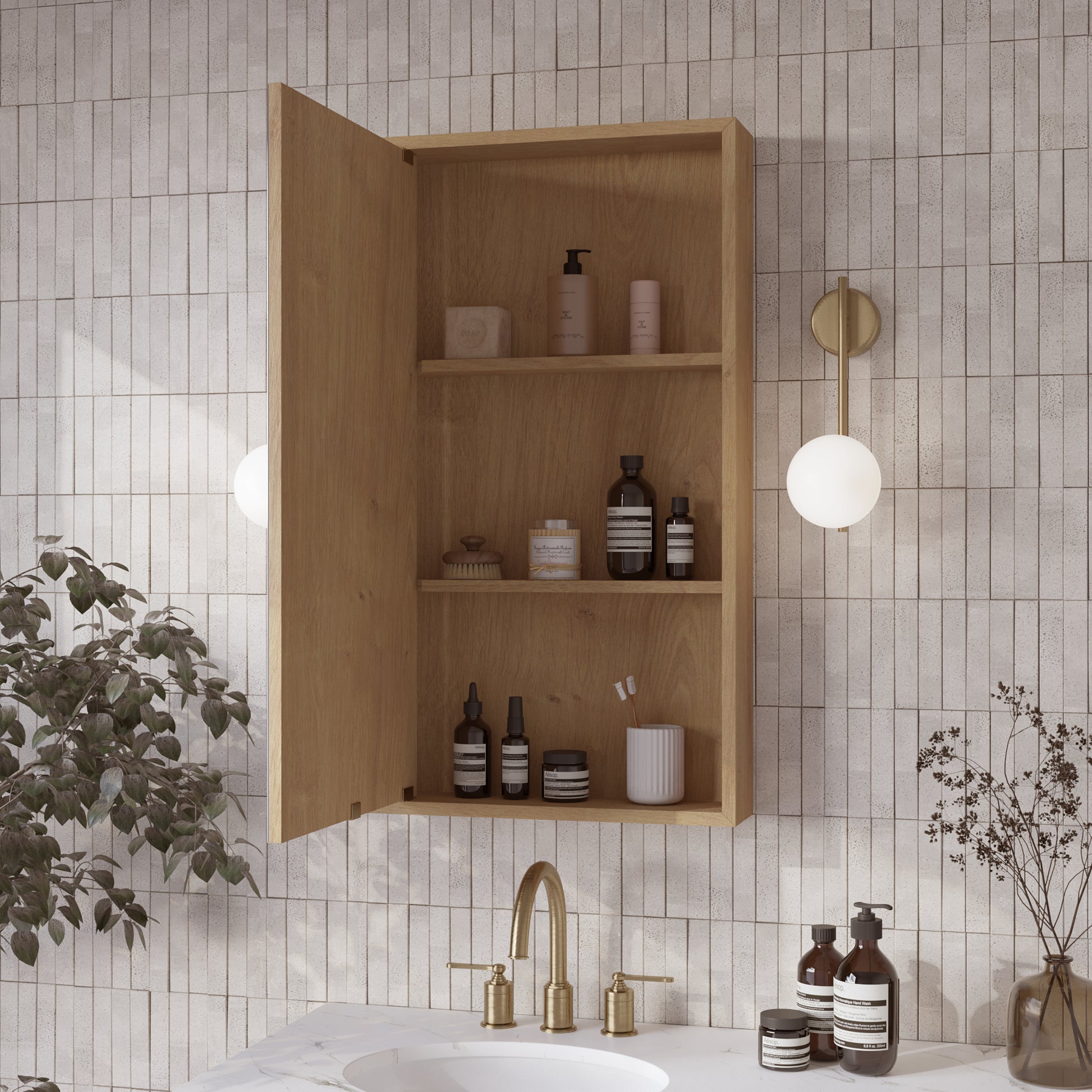 Customizable Storage: Two adjustable wood shelves with a matching veneer provide flexible space for toiletries and medicine bottles.