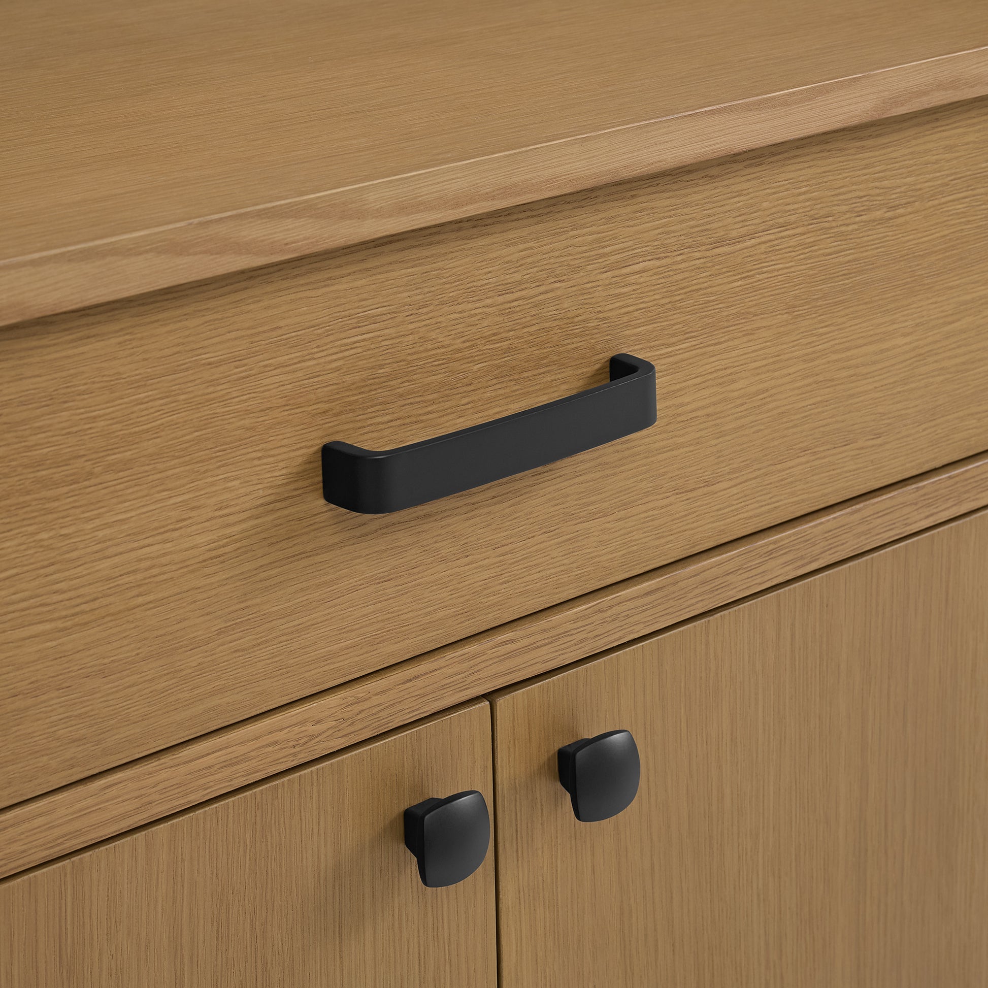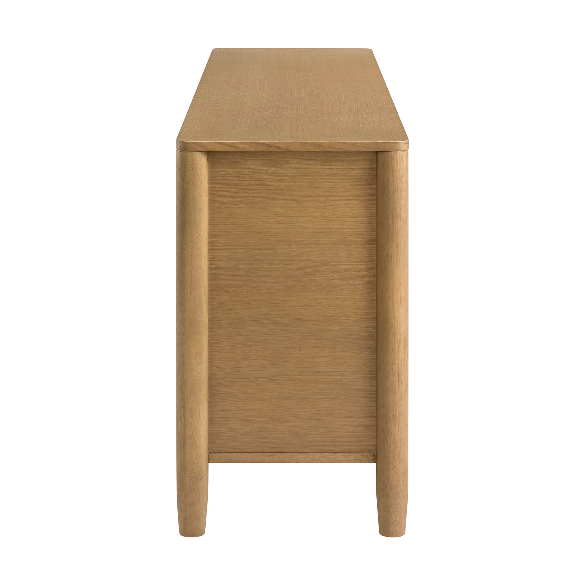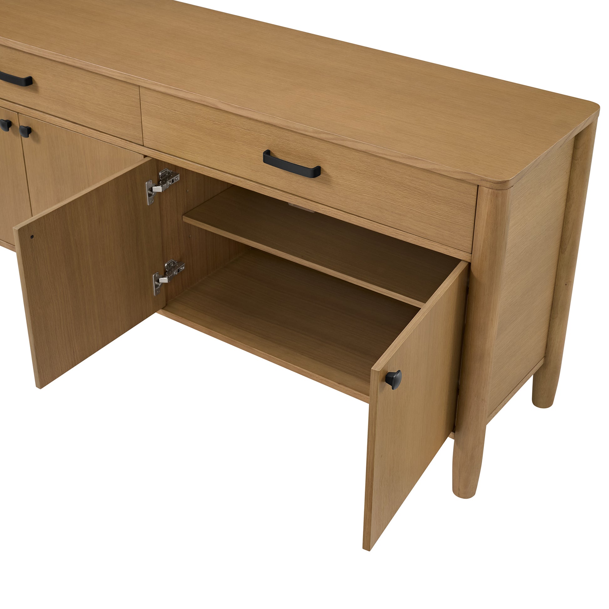 The ultimate solution for stylish storage, this 72-inch sideboard brings organizational elegance to your dining room, living room, or entryway. Perfectly blending modern farmhouse charm with clean, contemporary lines, this stunning oak sideboard is a versatile centerpiece. The natural light wood finish and signature rounded corners create a look that is both sophisticated and inviting. This wood buffet is designed for maximum utility, featuring two spacious top drawers for cutlery and linens, and four cabinet doors opening to a generous interior. Inside, adjustable shelves allow you to customize the space for everything from dinnerware to board games. More than just a dining room buffet, this piece effortlessly doubles as a sophisticated media console or TV Stand. Thoughtful cutouts for cable management in the back panel keep wires for your electronics neat and out of sight. Crafted from solid wood and durable oak veneers with sleek black hardware, this beautiful storage credenza arrives fully assembled, ready to anchor your space with its timeless design and unmatched functionality.