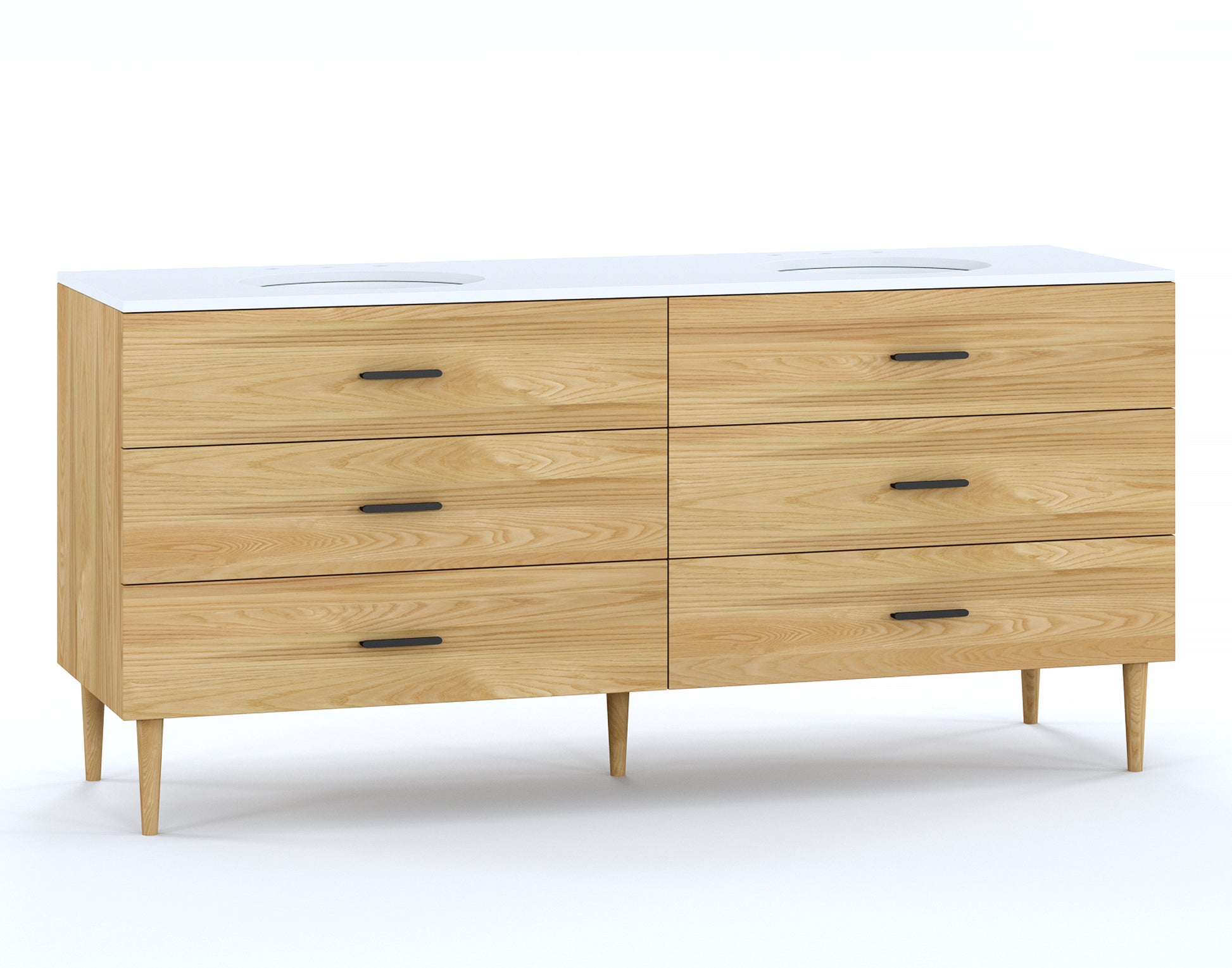 Mixing clean lines + cone legs with organic wood grains, this handcrafted double vanity delivers Scandi-inspired style – plus plenty of storage for self-care essentials. The six dovetailed drawers are set on soft-close glides and topped by a quartz counter with two ceramic under-mount sinks.