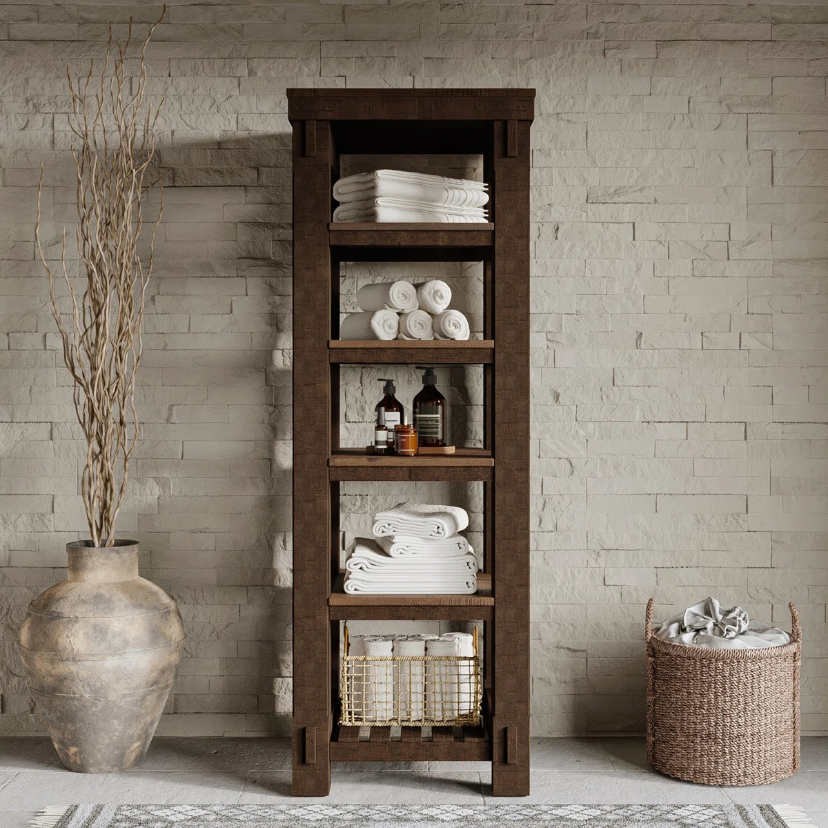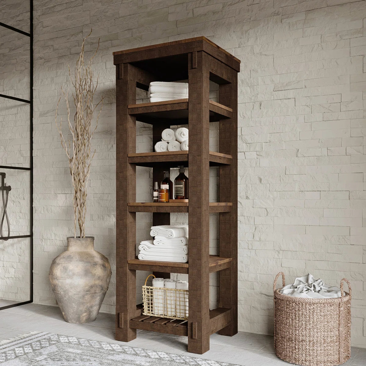 Complete your farmhouse bathroom with the Bromley Linen Tower, perfectly designed to complement the Bromley vanity collection with matching hand-distressed solid pine construction and rich brown, subtle two-tone wood finish. Standing 72" tall, this premium bathroom storage tower features five spacious open shelves that provide ample space for towels, linens, toiletries, and decorative accessories. Built with the same time-honored materials, construction, and quality as the Bromley vanity, this linen tower combines rustic charm with practical storage solutions. The hand-finished details and authentic farmhouse styling create a cohesive look that brings timeless charm to your bathroom while maximizing your storage capacity. Experience coordinated farmhouse charm with modern functionality in this expertly crafted linen tower that will last for years to come.