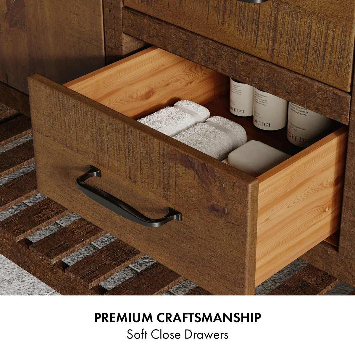 Transform your bathroom with the Bromley farmhouse vanity, featuring a hand-distressed solid pine frame with a rich brown, subtle two-tone wood finish and a pristine white quartz countertop with matte finish. This premium bathroom vanity combines rustic charm with modern conveniences, built with time-honored materials, construction, and quality. Ample storage is provided by soft-close, under-mount drawers crafted with dovetail joinery, plus open bottom storage perfect for displaying luxury linens and decorative baskets. The hand-finished details and authentic farmhouse styling bring timeless charm to any bathroom while offering the durability and functionality of contemporary design. Experience farmhouse charm with modern conveniences in this expertly crafted vanity that will last for years to come.