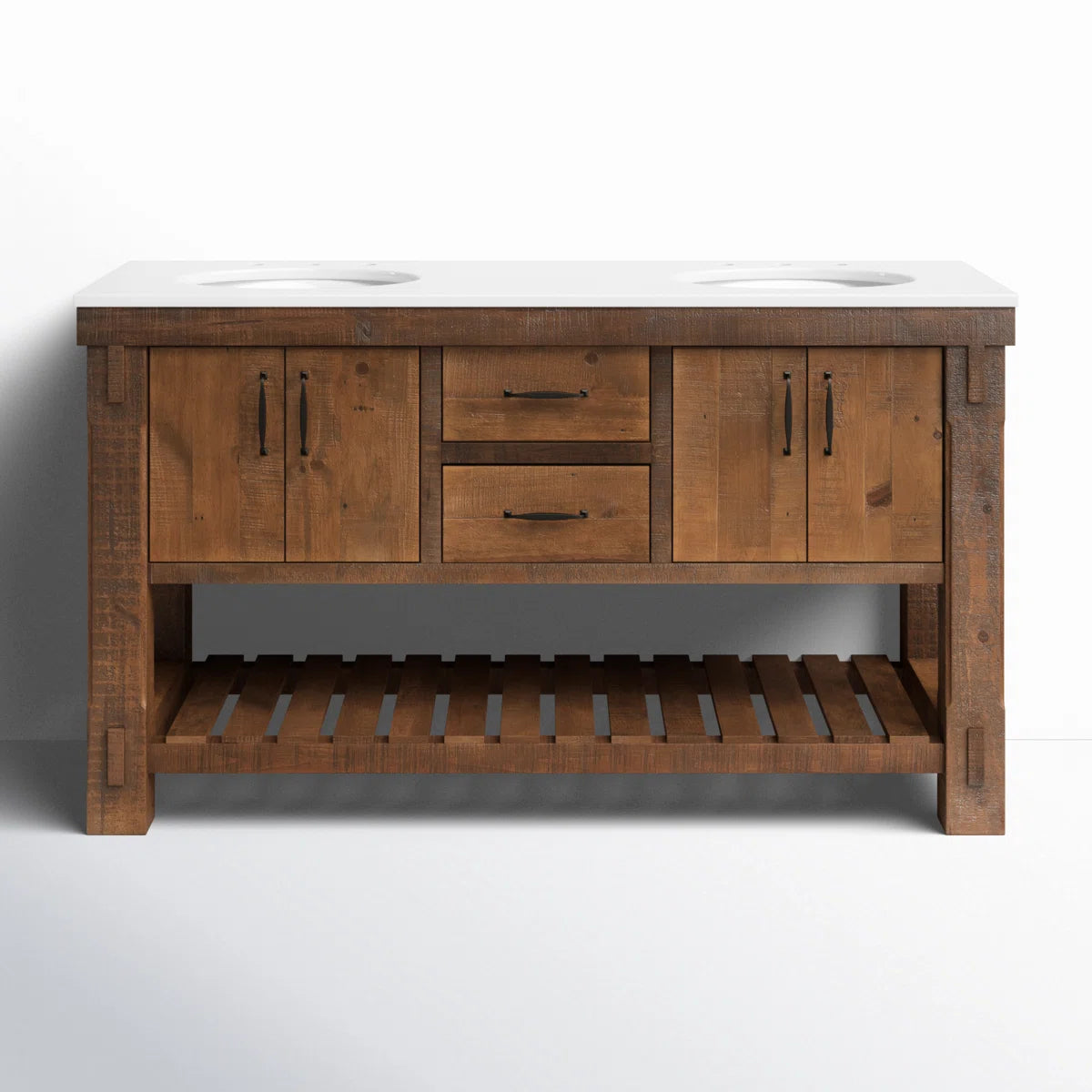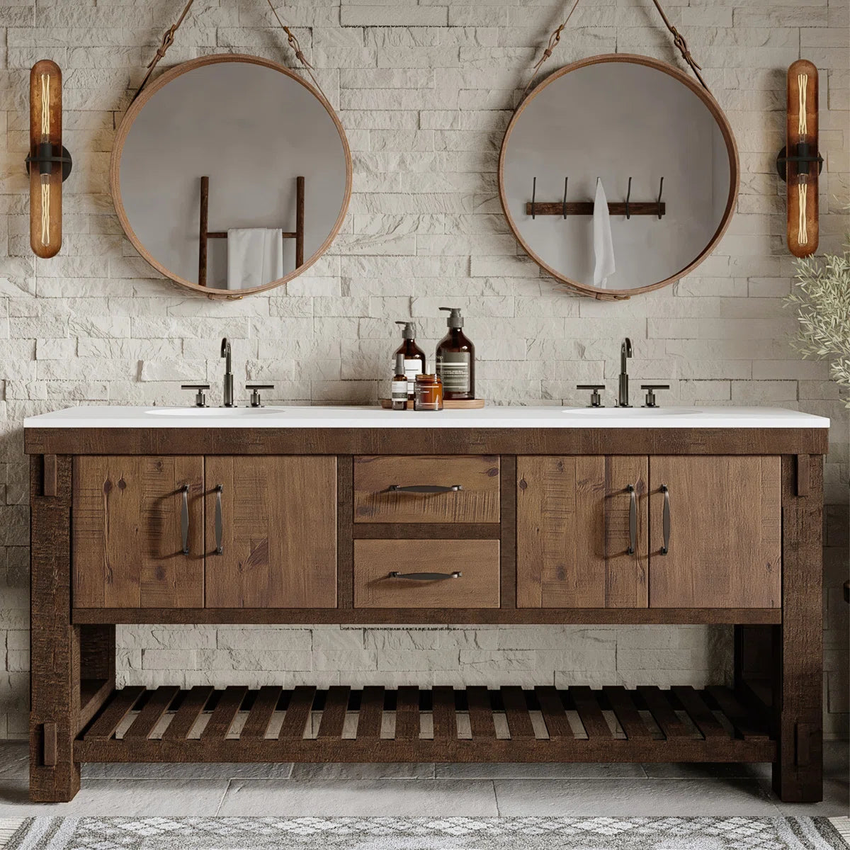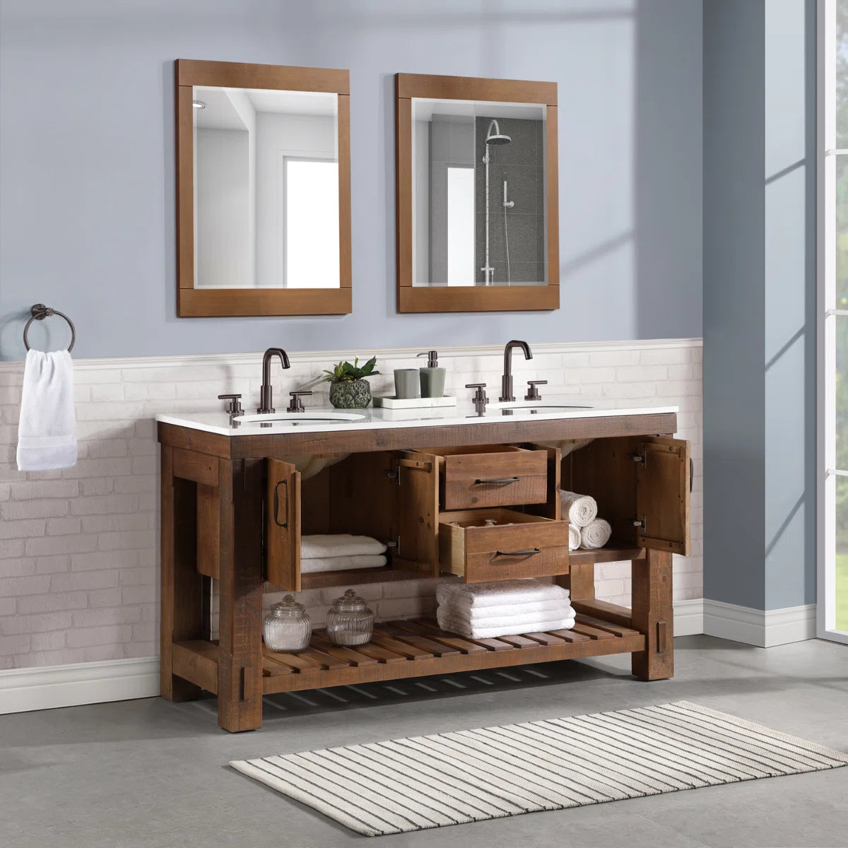 Transform your bathroom with the Bromley farmhouse vanity, featuring a hand-distressed solid pine frame with a rich brown, subtle two-tone wood finish and a pristine white quartz countertop with matte finish. This premium bathroom vanity combines rustic charm with modern conveniences, built with time-honored materials, construction, and quality. Ample storage is provided by soft-close, under-mount drawers crafted with dovetail joinery, plus open bottom storage perfect for displaying luxury linens and decorative baskets. The hand-finished details and authentic farmhouse styling bring timeless charm to any bathroom while offering the durability and functionality of contemporary design. Experience farmhouse charm with modern conveniences in this expertly crafted vanity that will last for years to come.
