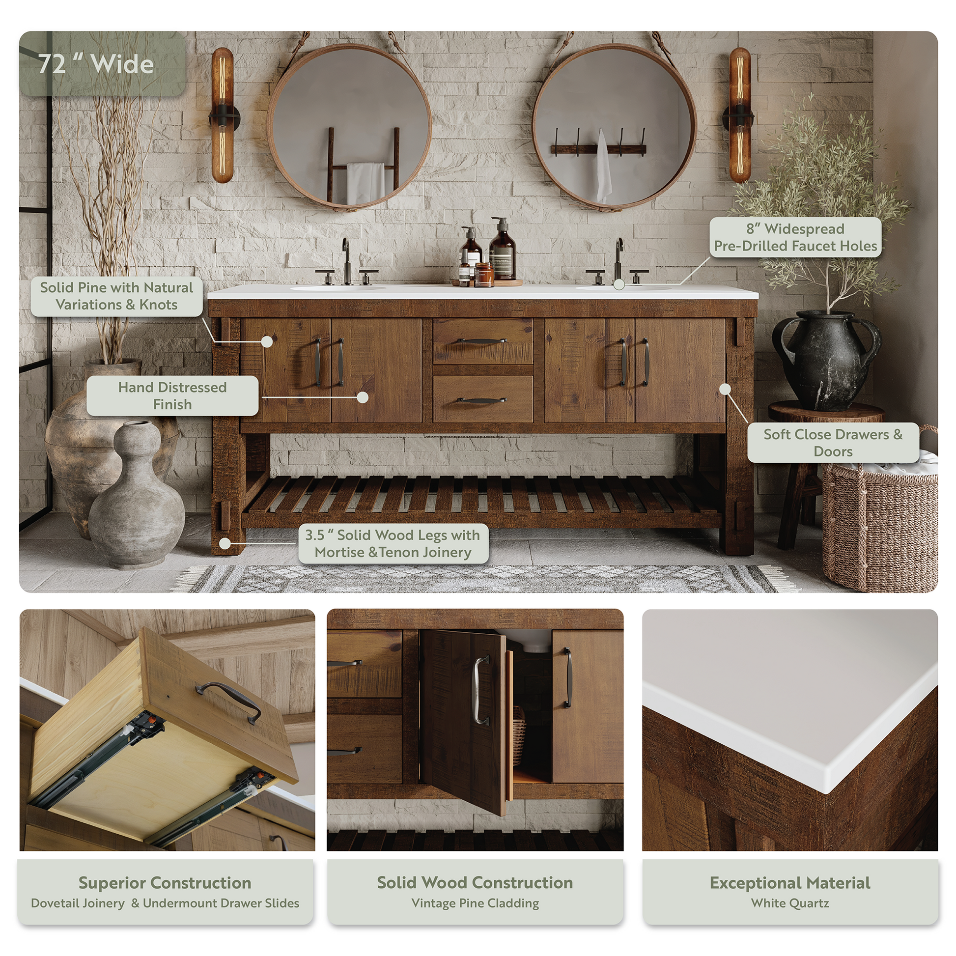 Transform your bathroom with the Bromley farmhouse vanity, featuring a hand-distressed solid pine frame with a rich brown, subtle two-tone wood finish and a pristine white quartz countertop with matte finish. This premium bathroom vanity combines rustic charm with modern conveniences, built with time-honored materials, construction, and quality. Ample storage is provided by soft-close, under-mount drawers crafted with dovetail joinery, plus open bottom storage perfect for displaying luxury linens and decorative baskets. The hand-finished details and authentic farmhouse styling bring timeless charm to any bathroom while offering the durability and functionality of contemporary design. Experience farmhouse charm with modern conveniences in this expertly crafted vanity that will last for years to come.